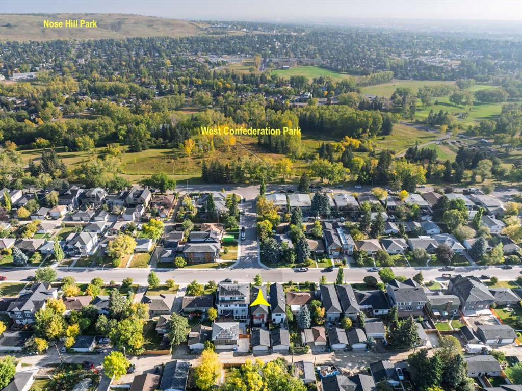 This beautifully maintained detached family home is perfectly situated in the highly desirable community of Banff Trail, just steps away from the year-round amenities of West Confederation Park. With access to scenic biking and walking paths, a golf course, tennis courts, splash park, pump track, natural playground, and seasonal activities like tobogganing and cross-country skiing, the location offers something for everyone. Thoughtfully designed for both comfort and function, this spacious two-storey residence features bright and inviting living spaces throughout. The main level showcases an open-concept layout filled with natural light from floor-to-ceiling windows, anchored by a double-sided fireplace that adds warmth and separation between the expansive living room and the elegant dining area. The kitchen boasts quartz countertops, stainless steel appliances including a one-year-old induction range, a large island, and a window overlooking the south facing backyard. A modern two-piece powder room completes the main floor. Upstairs, the primary suite is a true retreat, offering a large walk-in closet, a four-piece ensuite with double sinks and walk-in shower, and stunning park views through an oversized window. Two additional bedrooms share a stylish four-piece bathroom, while a convenient upstairs laundry room adds to the thoughtful layout. The fully developed basement extends the living space with a spacious recreation room, a generous fourth bedroom, and a three-piece bathroom—ideal for guests or extended family. Step outside to enjoy the sunny, south-facing backyard complete with a private patio perfect for outdoor dining and relaxation. An oversized double detached garage provides plenty of storage and parking. With nothing left to do but move in, this exceptional inner-city home offers unbeatable access to downtown, the University of Calgary, SAIT, Foothills and Children's Hospitals, all levels of schooling, and a wealth of community amenities.