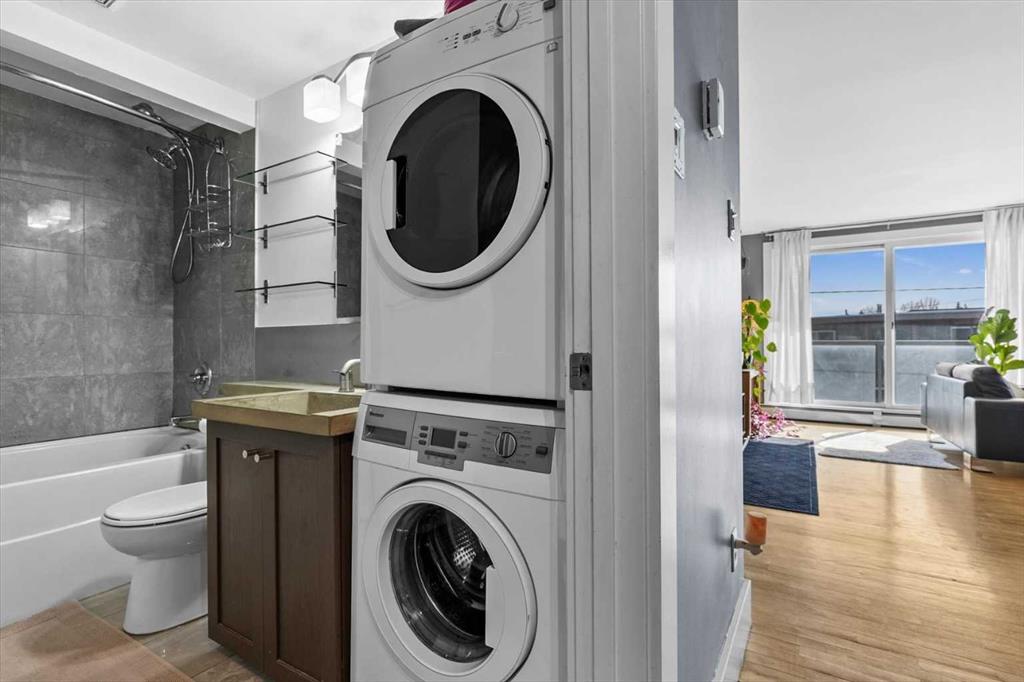 Welcome to this stunning executive 2-bedroom, 1-bathroom condo nestled in the heart of sought-after Bankview, one of Calgary's most vibrant and walkable inner-city neighbourhoods. Perched on the escarpment just minutes from the downtown core, this is a community that rewards those who seek a true urban lifestyle without sacrificing neighbourhood warmth. This is the backdrop of everyday life when you call this remarkable inner-city address home. Step inside and feel the difference immediately. This unit delivers a bold, thoughtfully curated industrial chic aesthetic that perfectly mirrors the creativity and character of the neighbourhood all around it. The open-concept floor plan is anchored by rich hardwood flooring, dramatic poured concrete countertops in the kitchen, and oversized south-facing windows that flood every corner with brilliant natural sunlight from morning through late afternoon. Natural light at this calibre is not a given in an inner-city condo, and here it is truly one of the defining features of the overall daily living experience. The kitchen is fully equipped with a sleek stainless-steel appliance package, a stylish eating bar perfect for casual morning coffee or relaxed evening entertaining, and generous counter and cabinet space thoughtfully designed for those who love to cook and gather. And when you are ready to venture out, the eclectic boutiques, acclaimed restaurants, and independent cafes of 17th Ave SW are just a short stroll away. The open dining and living areas are spacious and wonderfully versatile, large enough to accommodate a variety of furniture arrangements, and flexible enough to shift effortlessly between hosting a crowd after a night out on the town and a quiet, cozy evening in. Both bedrooms are well-proportioned and bright, each offering ample closet storage and a calm, restful atmosphere that busy urban professionals genuinely appreciate after a full day in the city. The 4-piece bathroom has been beautifully updated with custom tile work that carries the polished industrial aesthetic throughout with real cohesion and care. Convenient stackable laundry adds everyday convenience that elevates this space well beyond a typical condo offering. Step out onto the oversized private balcony, generously sized and finished with elegant, frosted glass panels for enhanced privacy. Ideal space for alfresco dining, or simply enjoying a glass of wine with friends on a warm summer evening. All of this is genuinely rare at this inner-city price point. Ideally centred between 33rd Ave and 17th Ave SW, you are steps from Calgary's finest restaurants, coffee shops, boutique fitness studios, live music, and much more. Bankview Park and its off-leash area are right at your doorstep, and downtown is just minutes away by car or bike. This exceptional unit includes a dedicated assigned parking stall and a private storage locker. Truly a one-of-a-kind gem in one of Calgary's most beloved inner-city neighbourhoods!!