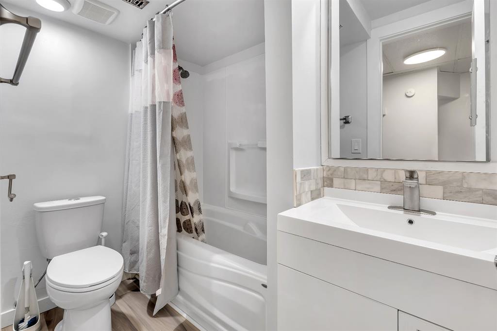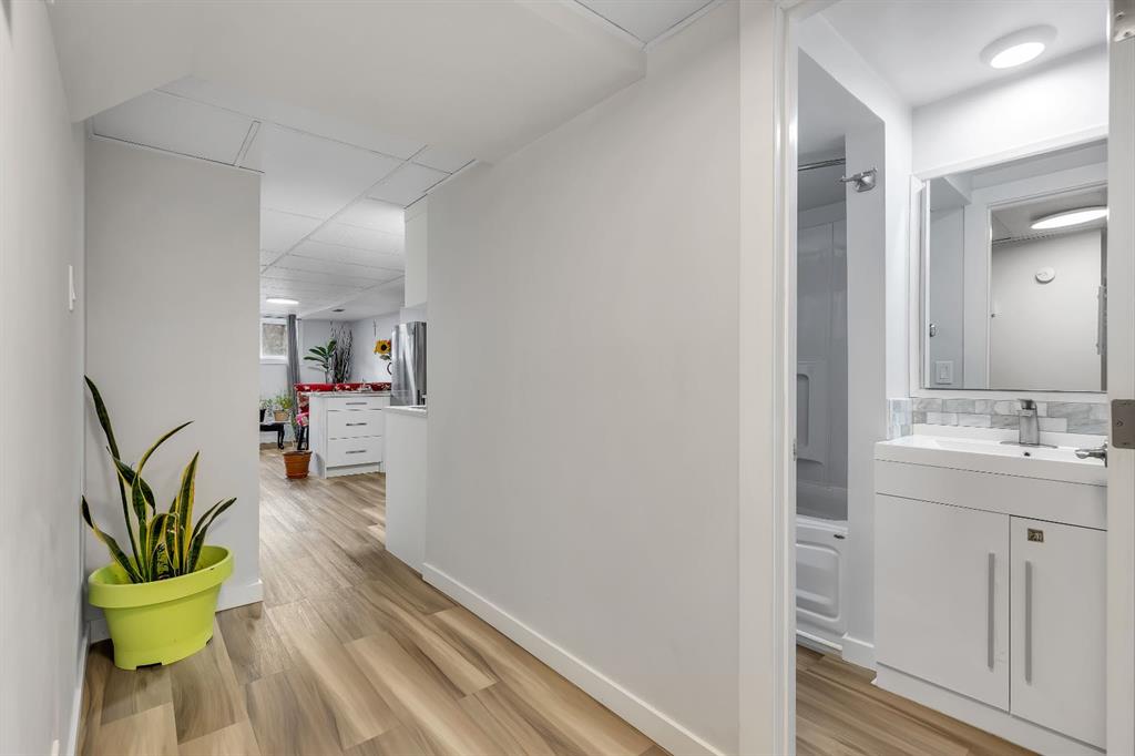 Downstairs, to the right, you’ll find the shared laundry area and utility room, which includes two high-efficiency furnaces (replaced about 5 years ago) and a new hot water tank (2024). To the left is the two-bedroom illegal basement suite. You’ll love how bright and open the space feels, thanks to the large windows. The suite’s kitchen features quartz countertops with a breakfast bar, new cabinets, and new stainless steel appliances, including a microwave hood fan and dishwasher. The four-piece bathroom offers plenty of storage behind the mirror.