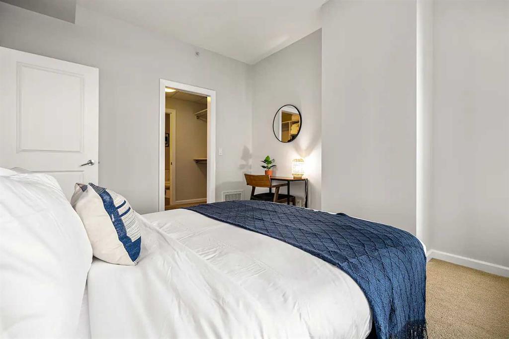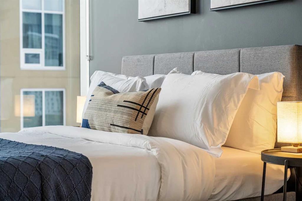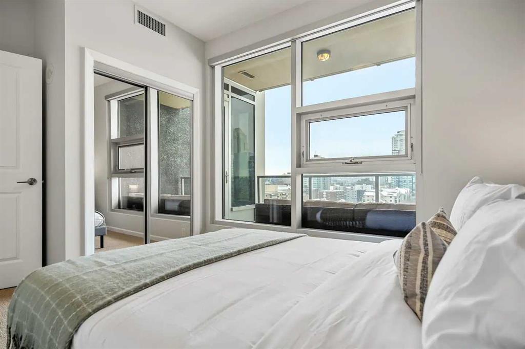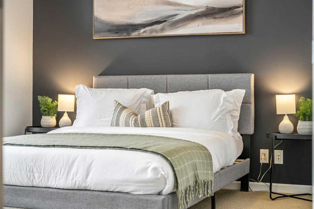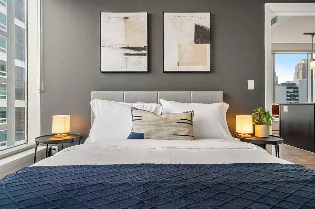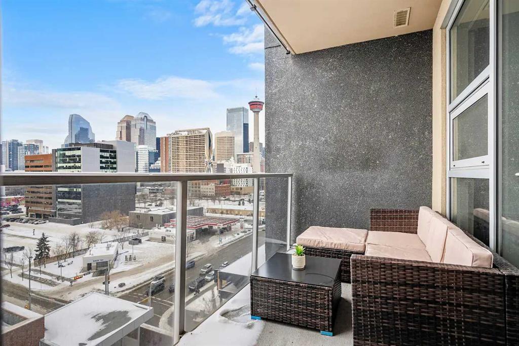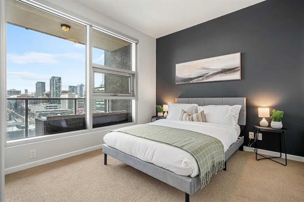 Experience Elevated Urban Living at Nuera! Step into sophisticated city living in one of Victoria Park’s most coveted buildings—Nuera. This stunning corner unit offers uninterrupted views of downtown Calgary, including the iconic Calgary Tower, through dramatic floor-to-ceiling windows and soaring 9-foot ceilings that flood the space with natural light from the west facing windows. Designed with both style and function in mind, this expansive 2-bedroom, 2-bathroom residence is the perfect blend of modern luxury and everyday comfort. The chef-inspired kitchen is the heart of the home, featuring sleek granite countertops, stainless-steel appliances, rich cabinetry, and a breakfast bar—ideal for entertaining or casual dining. The open-concept layout flows effortlessly from the kitchen to the designated dining area and bright, inviting living room, which opens onto a spacious private balcony with panoramic city views. The primary suite is a true retreat, complete with a generous walk-through closet with dual sides and a well-appointed 4pc ensuite. The second bedroom is thoughtfully positioned on the opposite end of the unit for optimal privacy—perfect for guests or a home office—and is paired with a stylish 3-piece bathroom just steps away. Additional features include in-suite laundry, a titled underground parking stall, secure storage, bike storage, and access to a state-of-the-art fitness centre. The building also offers the peace of mind of full-time security, concierge service, and underground visitor parking. All this in a prime location—just steps to the downtown core, C-Train, Sunterra Market, and the vibrant energy of 17th Avenue’s dining and boutique scene. Luxury. Convenience. Location. This is city living at its finest. Book your private showing today!