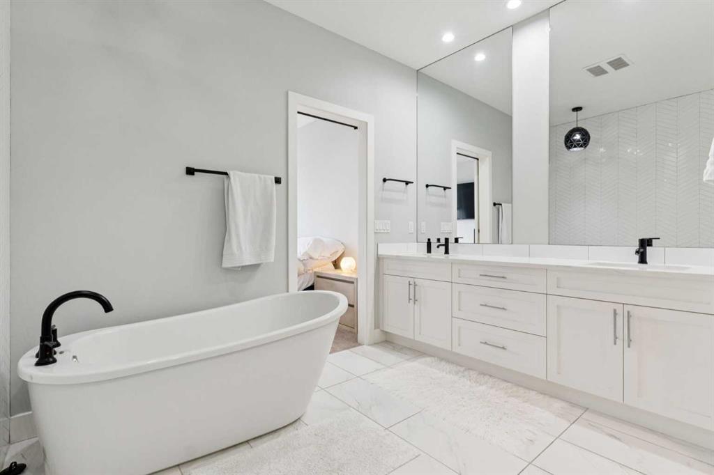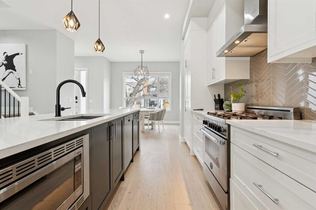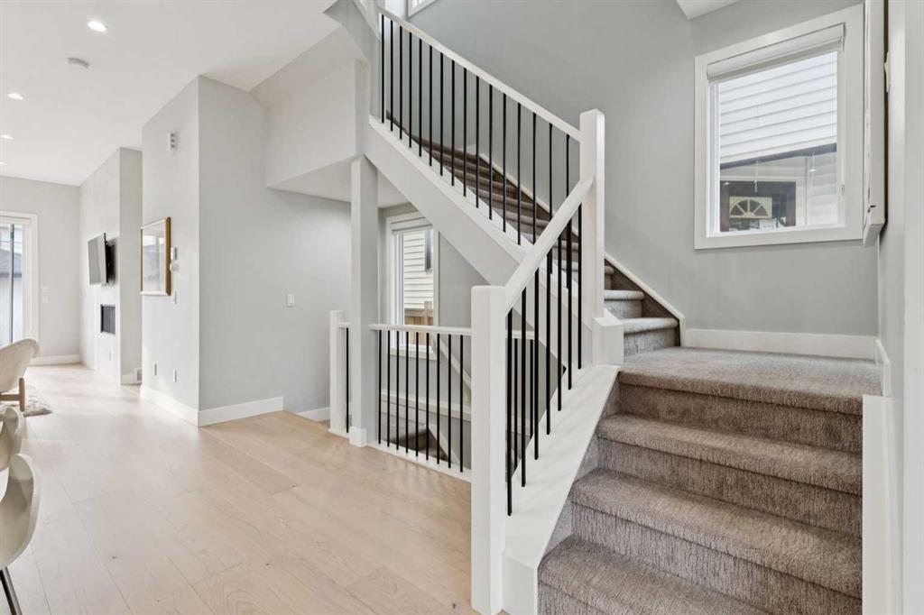 This sophisticated, contemporary semi-detached infill in Capitol Hill offers exceptional value with over 2,700 square feet of functional living space featuring 4 bedrooms, 3 and half bathrooms, premium finishes, and a south facing yard. The main floor boasts brand new engineered wide plank oak hardwood flooring, ten-foot ceilings, and generously proportioned living areas. These include a formal dining room, a living room with a sliding glass door to the rear yard, and a modern kitchen equipped with stainless steel appliances and shaker-style cabinetry. A tiled mudroom provides direct access to the double detached garage and includes built-in millwork for organized storage. A privately situated powder room completes this wonderful main floor. The upper level comprises three spacious bedrooms, two full bathrooms, and convenient second-floor laundry. The master suite features a sizable walk-in closet and a private five-piece ensuite with a freestanding soaker tub, a separate water closet, and an oversized glass shower. The fully finished basement includes a large recreation room with a wet bar, a fourth bedroom, and a fourth bathroom. Finally, the home is complete with air conditioning, charming landscaping, a very useful at-grade concrete patio, and irrigation. Book your private tour today.