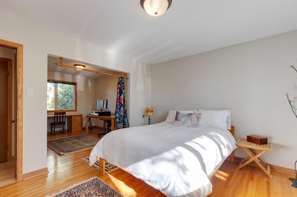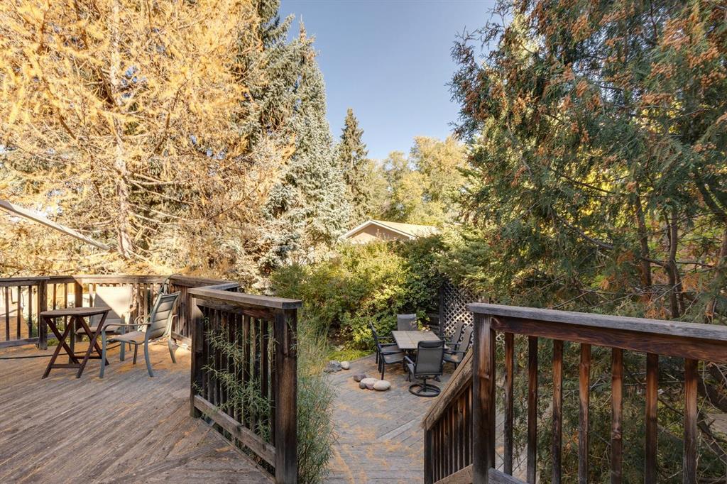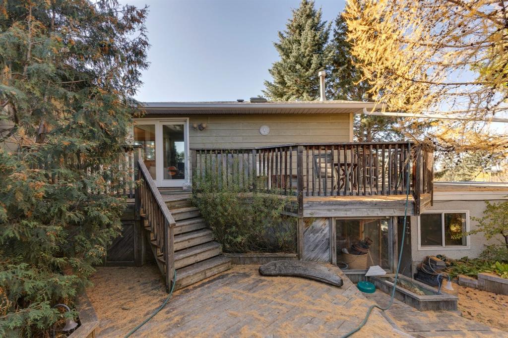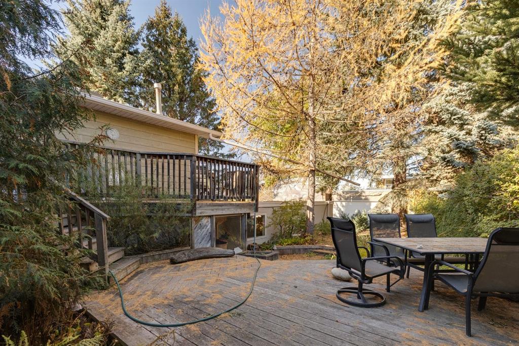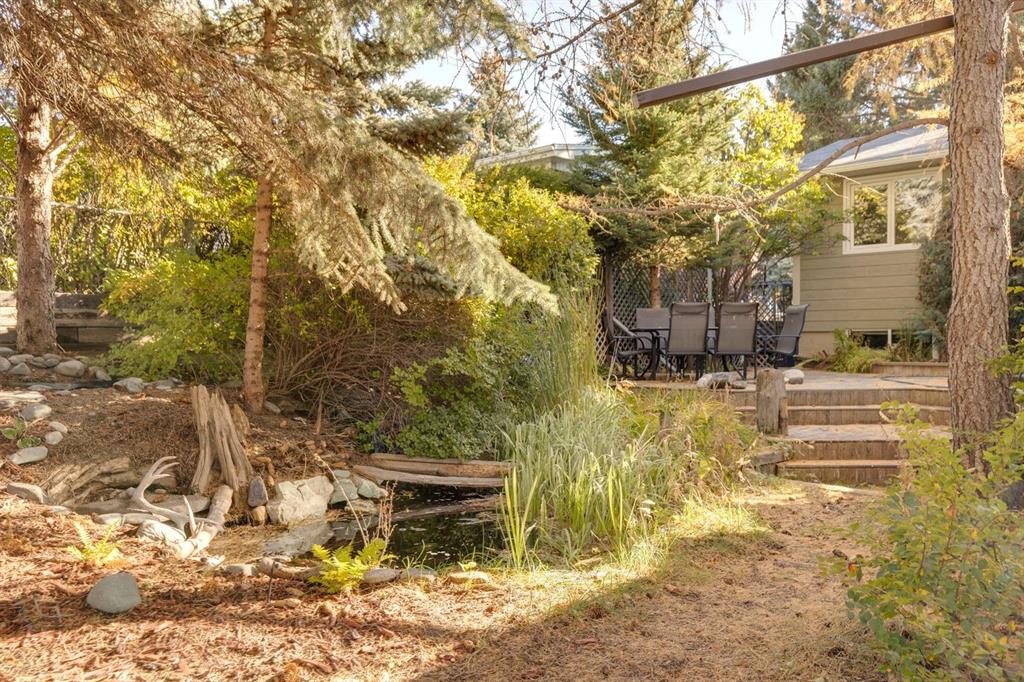 Welcome to this rare opportunity to own a beautifully renovated home in one of Calgary’s most sought after neighbourhoods. Nestled in the established and serene community of Charleswood, this nature wrapped retreat is steps to Nose Hill Park, and minutes to the University, LRT, Hospitals, and top schools The home is surrounded by forest-like, low maintenance landscaping that features mature trees, a self-contained creek with a waterfall and pond, colourful perennials, and an automatic irrigation system. Outdoor living is enhanced by a multi-tiered cedar deck, including a two-level main deck, a garage-roof deck with garden planter, and a lower private deck surrounded by gardens. There's also a reinforced rear concrete pad for RV or additional parking. Inside, you’ll find over 2,700 sq ft of thoughtfully renovated living space between two levels, offering 4 + 1 bedrooms, 2 full bathrooms, and multiple versatile living areas. The home’s layout is ideal for families, multigenerational living, or future development, with zoning that allows for secondary suites and the structural potential to add a third storey enhancing the already stunning mountain views. The main floor features warm maple flooring, a spacious living room with a gas & wood burning stone fireplace, and a sun filled dining area with southwest exposure. A beautifully renovated sunroom steals the show with a full wall of windows, Pella sliding doors to the cedar deck, a gas stove, built-in bookshelf wall, and new maple flooring. The adjacent kitchen is equipped with refinished maple quaker cabinetry, granite counters and backsplash, La JennAir range with downdraft, dishwasher, pot drawers, and a built-in recycling centre blending style and function. The main floor also includes a flexible bedroom layout that can be configured as one or two bedrooms to suit your needs, along with a full bathroom featuring an ultra-jet air tub, maple cabinetry, and tiled finishes. The lower level, fully refreshed in 2024, adds a large entertainment room with a Valor gas fireplace insert, a custom fir mantle designed for an 85” TV, and premium vinyl plank and oak parquet flooring. Three additional rooms can function as bedrooms, offices, or hobby spaces. A second full bathroom, two furnace/storage rooms, and laundry complete the level, offering both comfort and practicality. Access to the detached garage through a covered walk-way ensures you'll always remain dry while additionally offering storage for firewood. Blending natural wood, stone, and desert-toned tile finishes, this home harmonizes beautifully with its lush surroundings. Whether you’re entertaining guests in the sunroom, exploring nearby Nose Hill Park, or unwinding in your private backyard oasis, this stunning home offers the perfect balance of nature, comfort, and city convenience. Book your showing today and experience this truly one-of-a-kind property.