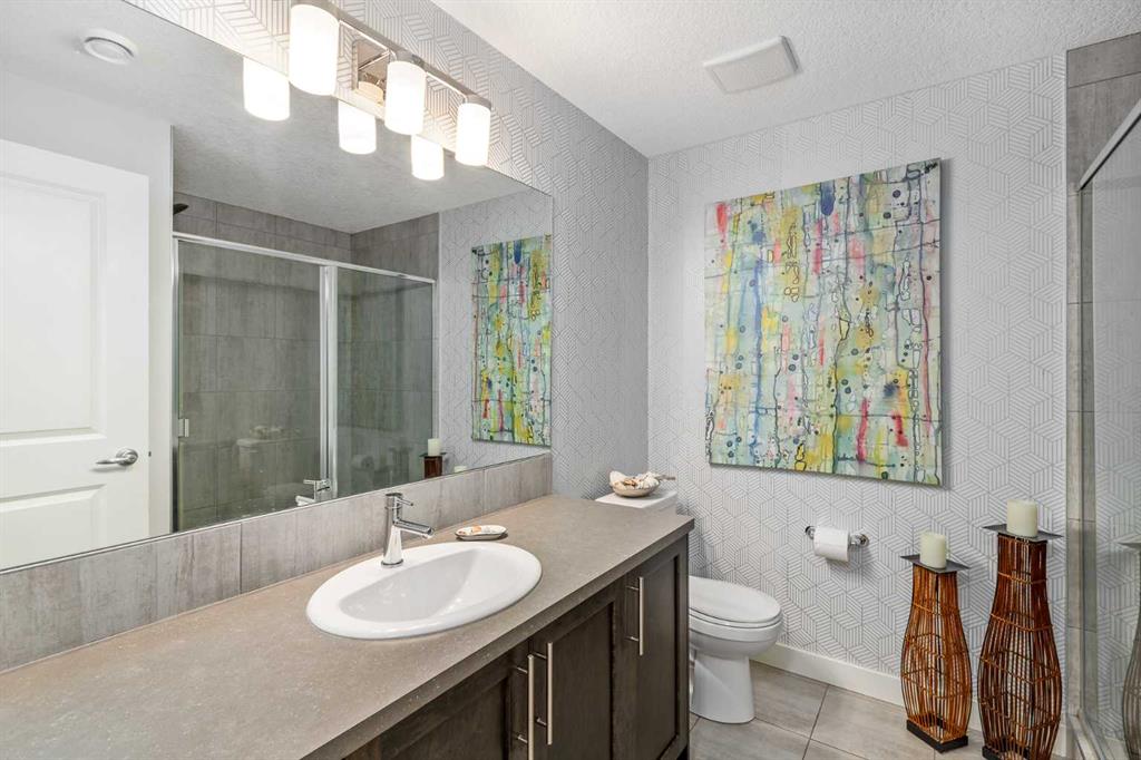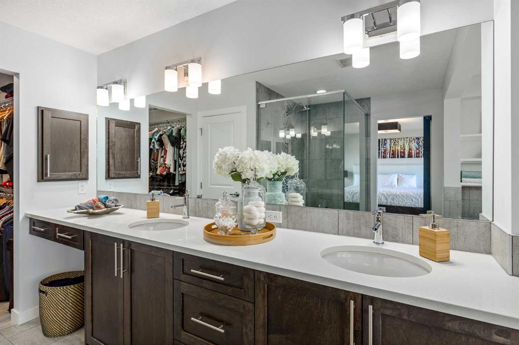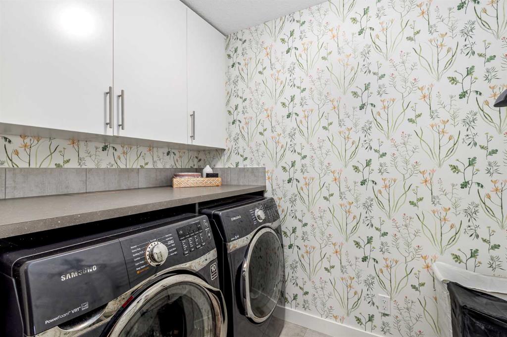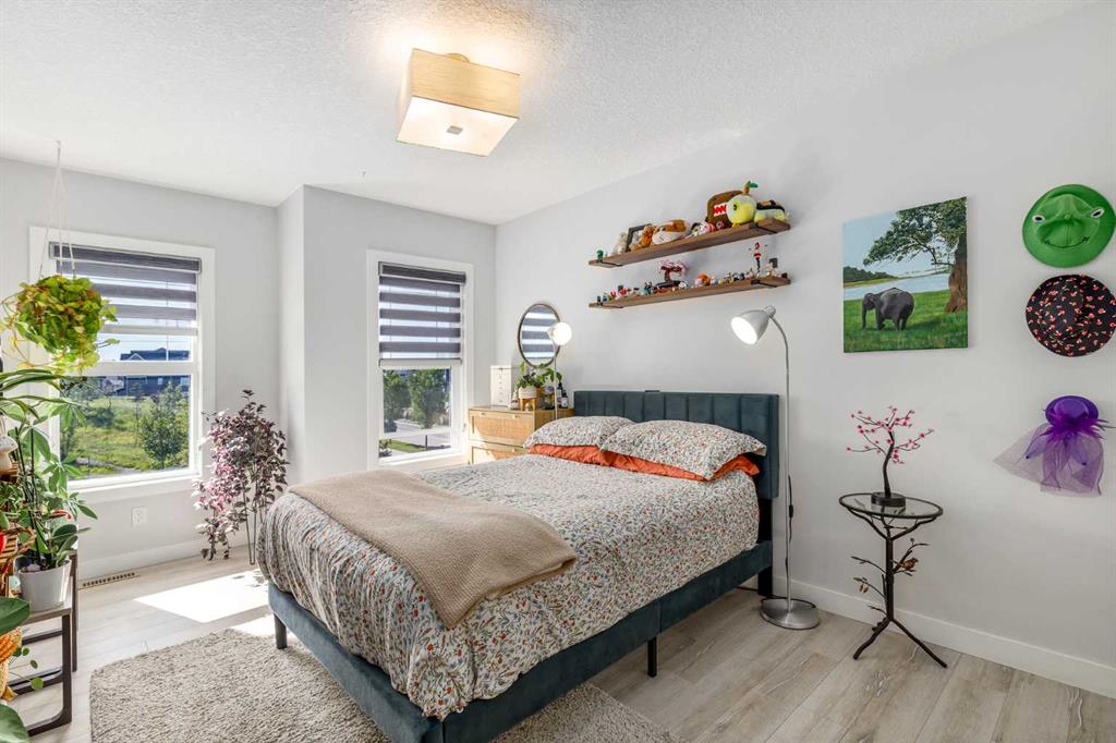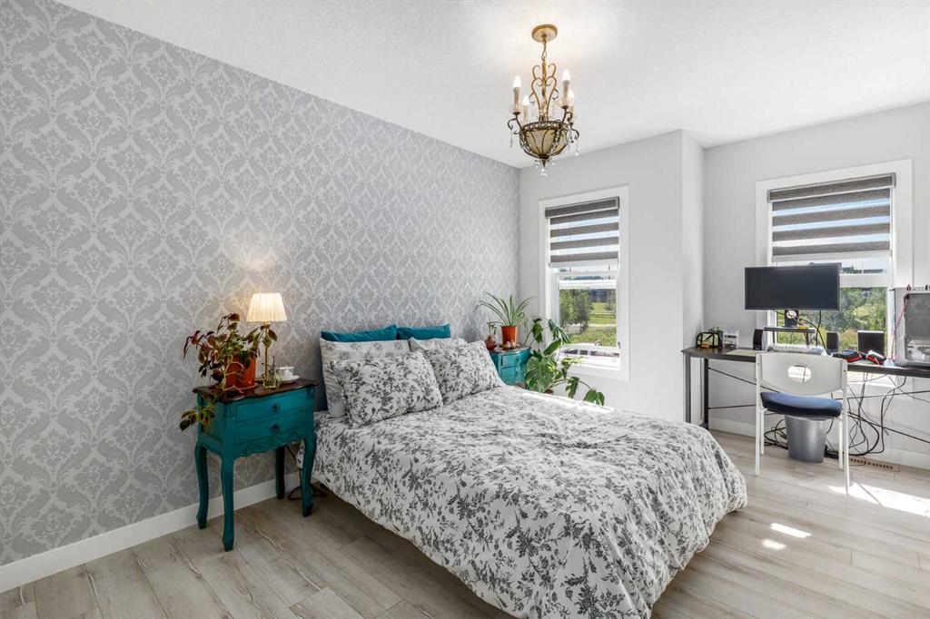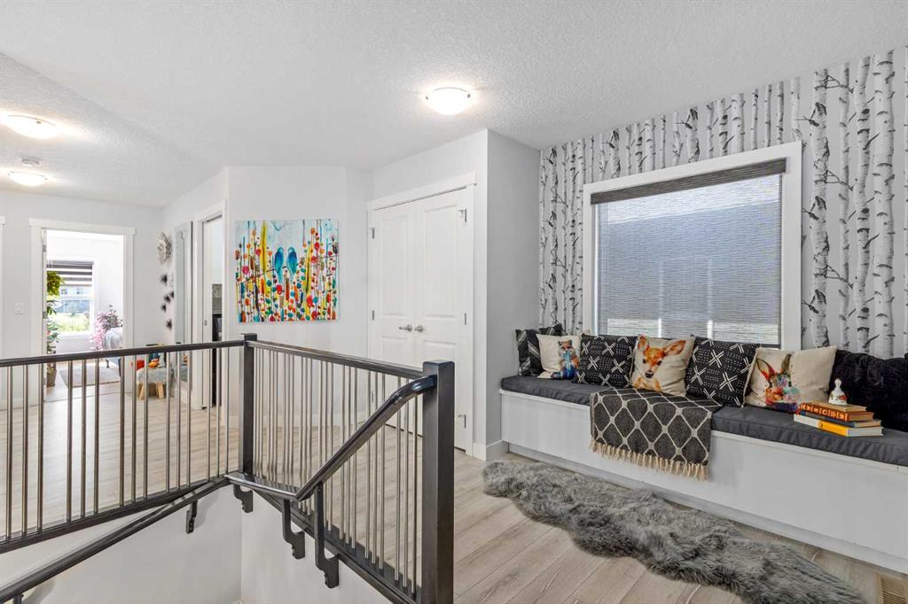 From the moment you step inside, this stunning home feels like something out of a Pinterest board or a high-end interior design magazine. Every detail has been thoughtfully selected & expertly executed, making it a true showstopper that shows 10 out of 10. Located in the prestigious community of Riverstone in Cranston, this 2,500 sq ft two-storey home offers an unbeatable lifestyle—BACKING DIRECTLY onto a tranquil NATURAL RESERVE & fronting onto a kid-friendly playground. It’s the ideal combination of luxury, functionality, & location. Inside, you’re greeted by 10' ceilings, acacia hardwood floors, & a layout that flows effortlessly. The front dining room features a double tray ceiling & a striking designer light fixture, while the expansive rear living room is anchored by a gas fireplace wrapped in marble-style tile with a lower hearth. Large windows along the back wall frame serene views of the green space beyond, bringing the outdoors in. The chef’s kitchen is a showpiece—featuring full-height dark-stained cabinetry with bar pulls, white quartz counters, upgraded appliances, & a stunning herringbone tile backsplash that extends to the ceiling around the hood fan. A cabinet-style pantry wraps into a coffee bar nook for added function & flair. The back mudroom connects seamlessly to the oversized garage & includes locker-style built-ins. A beautifully wallpapered 2-piece powder room adds a touch of charm. Upstairs, the large bonus room is wrapped in modern railing & showcases a birch forest wallpaper feature wall, built-in ceiling speakers, & laminate floors that continue throughout the upper level (carpet only on the stairs). A convenient built-in desk area outside the kids’ bedrooms creates a perfect zone for homework or study sessions, while a built-in bench at the top of the stairs offers a cozy reading nook. All three bedrooms include custom California Closet-style built-ins for thoughtful storage. The primary suite overlooks the peaceful reserve & features a spa-like ensuite with a large soaker tub framed by a picture window, a massive glass shower, dual sinks with a dedicated vanity space, & a barn-style door leading to the generous walk-in closet. The professionally finished basement, completed by the builder, extends the living space with durable laminate floors, a spacious rec room, a bright fourth bedroom with a wallpaper feature wall, a 4-piece bathroom, & a sleek wet bar complete with sink & mini fridge—ideal for entertaining or relaxing movie nights. Step outside to discover your private oasis. The beautifully landscaped backyard is designed for both comfort & calm, with mature trees providing privacy & a two-tiered deck perfect for hosting or unwinding. A cozy hot tub area invites you to relax year-round, while thoughtful details like under-deck storage and low-maintenance landscaping enhance the functionality. With no neighbours behind and the natural reserve just beyond your fence line, this backyard is a serene retreat immersed in nature.
