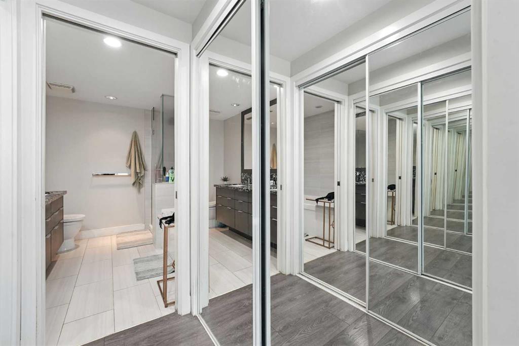 This is a space where style meets function. The bright, open-concept layout is framed by floor-to-ceiling windows that fill the home with natural light. The contemporary kitchen features a gas range, granite countertops, and stainless steel appliances—perfect for a quick meal or a gourmet dinner. Both bathrooms offer the luxury of heated floors, while the primary ensuite boasts dual sinks and a separate tub and shower. Central A/C, in-suite laundry, and secure underground parking and storage add to the low-maintenance appeal.