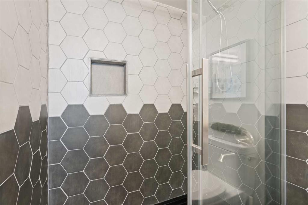 The stylish kitchen is complete with high-gloss acrylic cabinetry, sleek quartz countertops, and stainless steel appliances, making it a chef’s delight. The bathroom has been thoughtfully updated with a stand-up shower and sliding glass doors, offering a spa-like retreat.