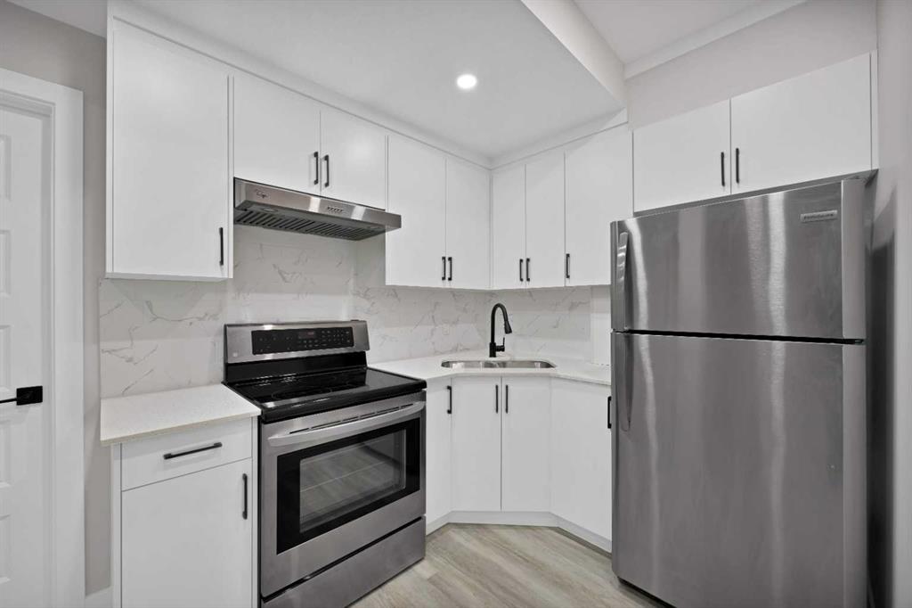 Electric stove, Refrigerator, Hood fan. |
