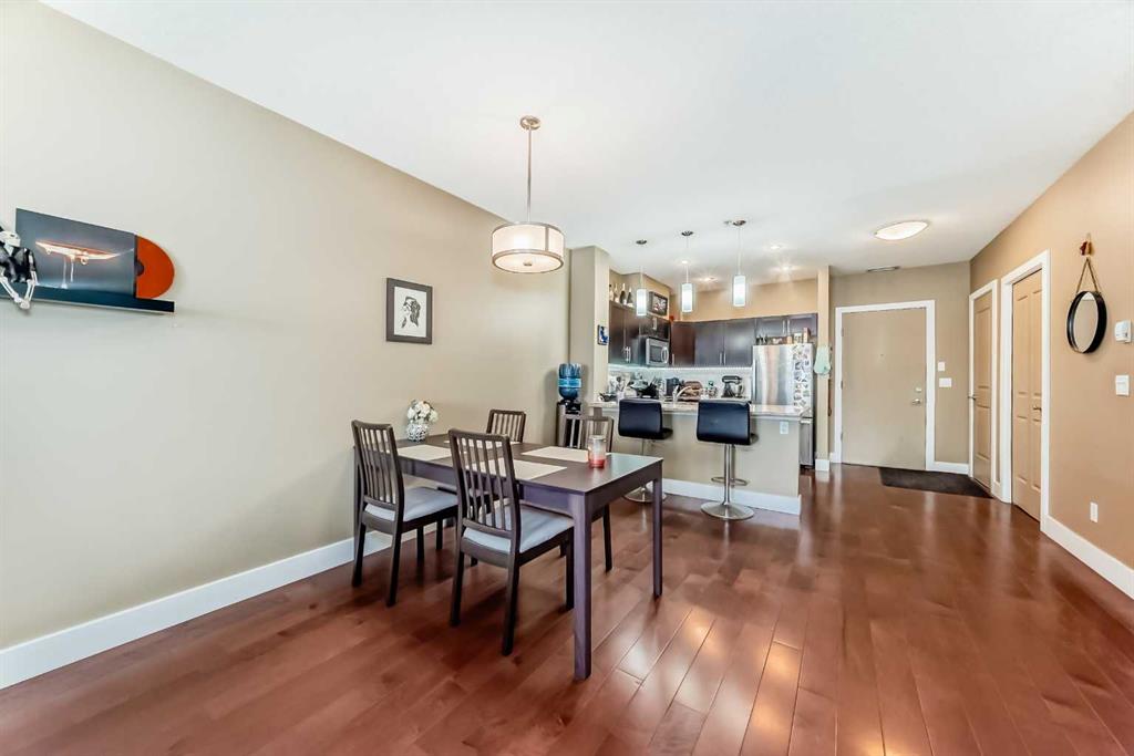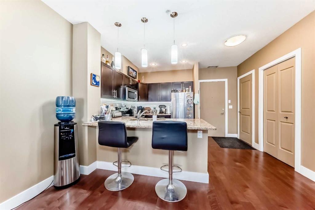 This beautifully appointed two-bedroom condo features 9-foot ceilings and in-floor heating for year-round comfort. The open-concept floor plan makes entertaining effortless, highlighted by engineered hardwood floors, granite countertops, and a spacious living and dining area that flows seamlessly to your private balcony — complete with a gas BBQ hook-up.