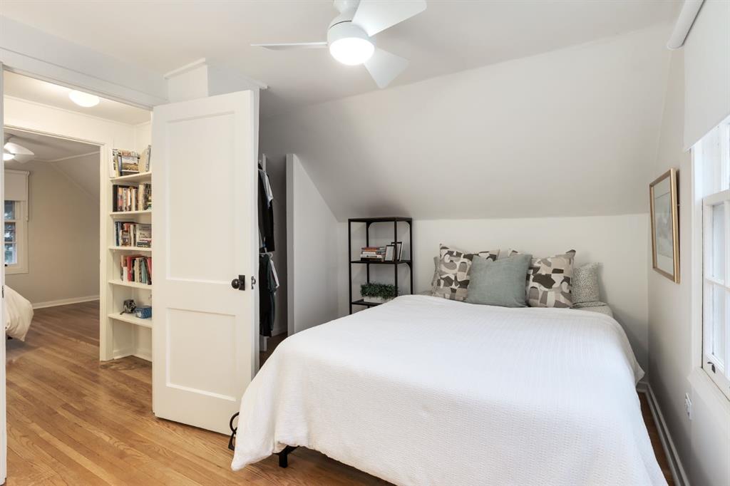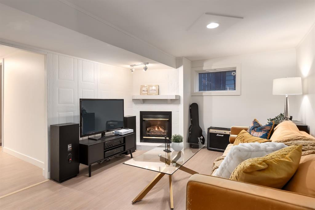 Upstairs, you’ll find two generous bedrooms, each tucked beneath the slope of the roofline — creating whimsical vaulted ceilings and cozy architectural character. From the rear entry, the stairs lead to a fully developed basement, offering a bright and renovated recreation area complete with an electric fireplace — equal parts stylish and inviting. A large additional bedroom, second bathroom, and laundry space provide excellent flexibility and storage. Fresh paint, updated details, and preserved original elements blend seamlessly, adding personality in all the right places.