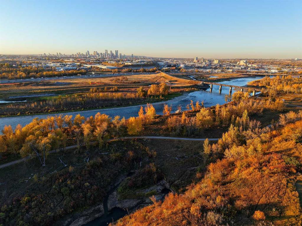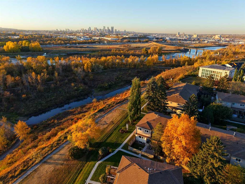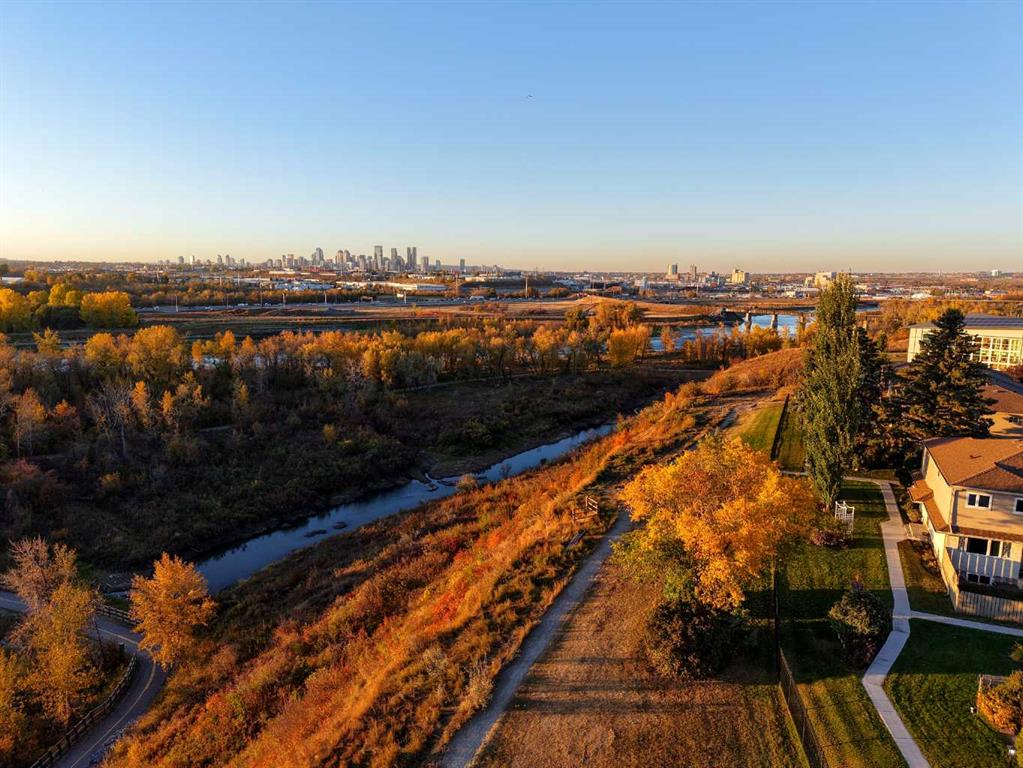 For anyone who is tired of the boxes being built across the city...and is looking for a true character home at an affordable price...then pay attention! This beautifully located 2 Story home with a fully finished basement has it's own private front yard overlooking a private play park and green space. Not only that...it backs onto ONE OF THE MOST GORGEOUS DOWNTOWN/BOW RIVER SUNSET SCENES this City has to offer | 3 Bedrooms Upstairs + Newer Second Level Carpet | 1.5 baths | Stylish All-White Kitchen w/New Quartz Countertops + New Dishwasher | Fully Developed Basement w/Wet Bar + 2025 Egress Basement Window | Large Storage Room | Laundry Room | PET-FRIENDLY COMPLEX | Unbeatable Location atop a redevelopment Green Line Community with direct access to beaver dam flats & bow river pathways. Your summer nights will never be the same. Step outside for an evening stroll and soak in views showcasing all this city has to offer. Watch the Stampede Fireworks after a family Bar-B-Que in your private front yard? Maybe a morning cup of coffee while the kids play in the park out front. This isn't just a new home to live in...this is a new life to live! Move-in-ready and filled with natural light, this charmingly nestled townhome is perfect for families, first-time buyers, downsizers seeking low-maintenance living without compromise. The spacious main floor welcomes you with a bright, comfortable and very large living area designed for gathering and relaxation in front of your custom made feature wall.. An inviting dining space connects seamlessly to the white, timeless kitchen featuring ample cabinetry, generous counter space and a subway tile backsplash for a clean, classic look. An updated powder room adds everyday convenience and elegance. 3 bedrooms on the upper level provide plenty of flexibility for family life, guests or a home office, complemented by an updated 4-piece bathroom. Downstairs, a large recreation room offers versatility for media, games, fitness, work or play complete with a built-in bar for easy drink and snack refills, along with ample storage. Step outside to your private fenced yard, where mature landscaping, a tranquil pond and a deck create a peaceful outdoor retreat ideal for summer nights or quiet mornings. Riverside Gate is a well-managed, pet-friendly complex known for its welcoming community feel and beautifully maintained shared courtyards with playgrounds and green spaces. They really don't make em like this anymore. Assigned owner parking and tonnes of street parking ensure easy access for you and your guests. From your doorstep, enjoy direct access to the scenic Bow River pathway network and the natural beauty of Beaver Dam Flats, perfect for walking, cycling and year-round exploration. This home offers quick access to schools, parks, shopping, transit and Deerfoot Trail, with the future Green Line LRT station nearby and downtown Calgary just a 10-minute drive away. Don't wait! Call your realtor and book an showing today!