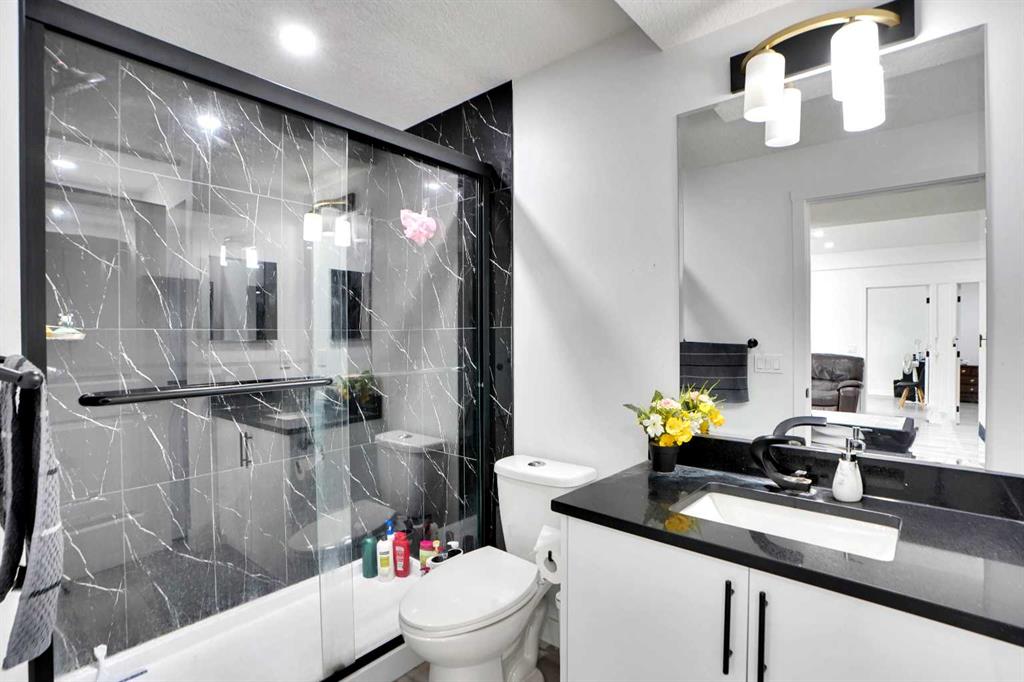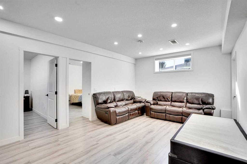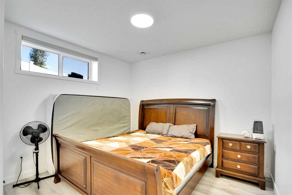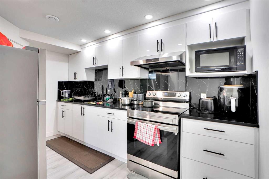 The fully finished basement suite (illegal) with separate side entrance includes two generous bedrooms, a modern kitchen with pantry, a full bathroom, and stacked laundry.