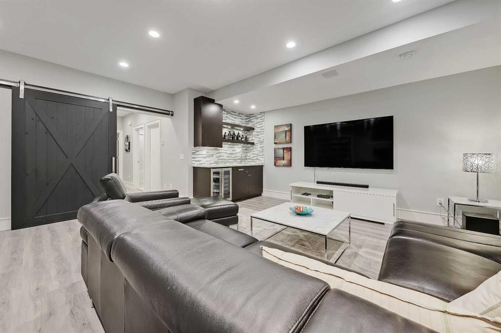 STYLE, COMFORT, AND LOCATION. Experience the best of Marda Loop living in this gorgeous semi-detached home located in the highly sought-after Richmond community. Just a quick 10-min walk away from shops, amenities, fitness studios, restaurants, and more! Families will appreciate the proximity to schools, parks, and playgrounds. Recently renovated and meticulously maintained, this home boasts over 2,700 sq ft of developed living space, 4 beds and 3.5 baths, a spacious basement, a private fenced backyard, and a double detached garage. This is a perfect opportunity for anyone seeking the best of inner-city living. Step inside through the oversized custom fibreglass front door into the welcoming formal front foyer with tiled flooring and a large closet. The main floor features engineered hardwood flooring throughout, leading to the bright formal dining room, which offers plenty of room for a full furniture arrangement. The modern kitchen features ample cabinetry and counter space, quartz counters, and a central island with bar seating, dual basin stainless steel sinks with a garburator, and a full stainless steel appliance package. The adjacent dining nook with an accent stone wall is a great spot for casual meals. The expansive living room boasts a custom built-in entertainment center with display shelves and pull-out drawers, and a tiled gas fireplace. High-end Pella glass sliding doors lead to the rear deck and backyard. Just off the living room is a convenient tiled mudroom with a pocket door, built-in storage, hooks and access to the backyard. Neatly tucked away, a 2pc powder room with tiled flooring completes the main floor. The upper floor showcases an impressive primary bedroom with large windows, a private balcony, a walk-in closet, and a luxurious 5pc ensuite. The ensuite features a quartz vanity with dual sinks and storage, a drop-in soaker tub with a handheld shower wand and tile surround, and a fully tiled stand-up shower. Two additional bedrooms with oversized windows and large closets, a main 4pc bathroom, and a tiled laundry room provide comfort and convenience. Downstairs, the fully developed basement features luxury vinyl flooring and in-floor heating throughout. A modern barn door opens into the massive rec room, which features a wet bar with a beverage fridge, quartz counters and tiled backsplash, and shelving. Down the hall, you’ll find a wine room with 10 mm glass enclosure, a guest bedroom with a walk-in closet, and a sleek 4pc bathroom. Outside, enjoy a composite deck, stone patio, grassy area, gas line for BBQs, and an insulated, drywalled, double-detached garage. Additional features include a high-efficiency furnace, central A/C, new roof (2024), new front door (2023), new main-floor sliding doors (2023), and a new fridge (2024). Don't miss out on this exceptional property that offers style, functionality, and an unbeatable location. Schedule your showing today and discover the best of Marda Loop living!