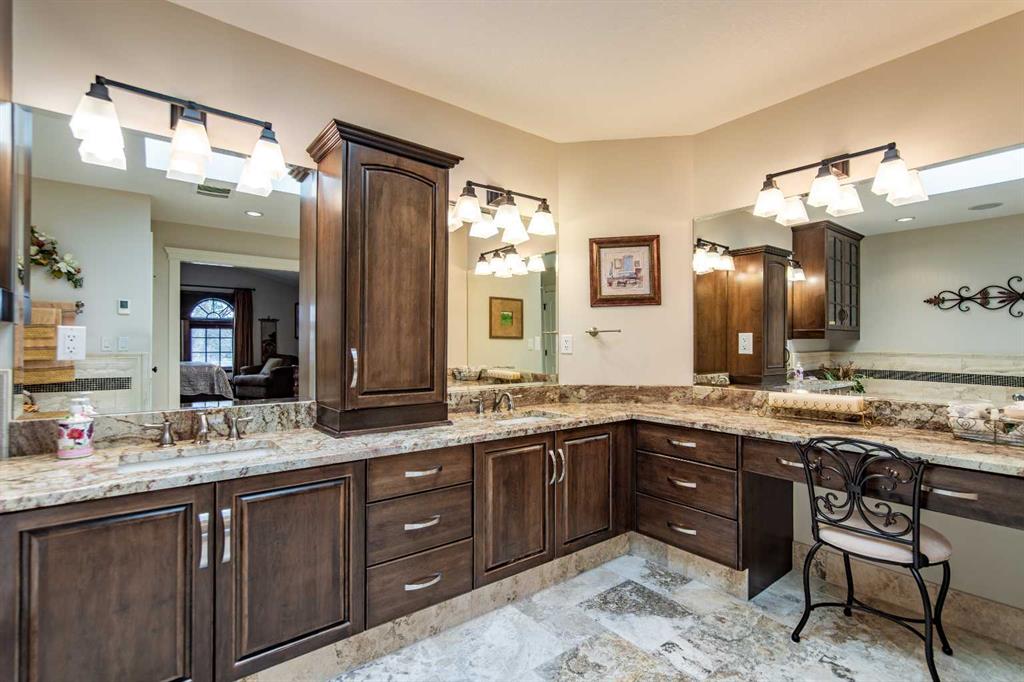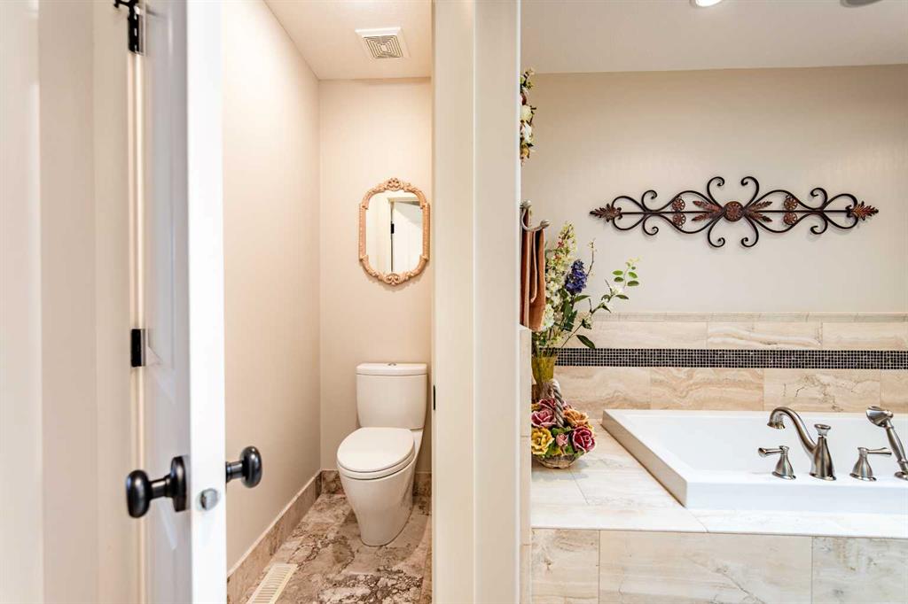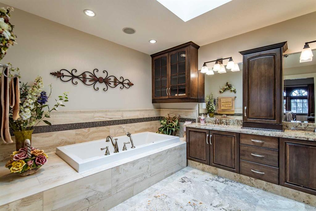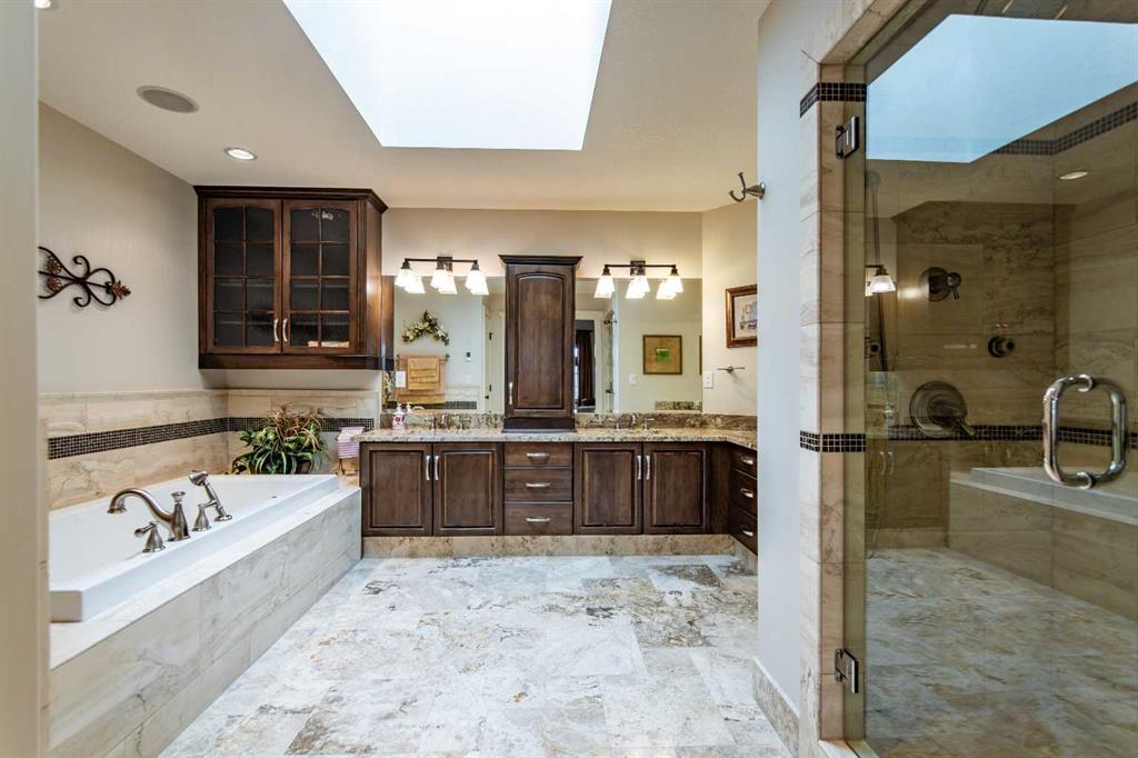 A stunning spiral staircase leads to the upper level, where you’ll find three spacious bedrooms, a convenient laundry room, and a well-appointed 4-piece bathroom. The luxurious primary suite offers a walk-in closet and a spa-like 5-piece ensuite complete with heated travertine floors, dual sinks, and a relaxing jetted tub ans lots of natural light from a large skylight.