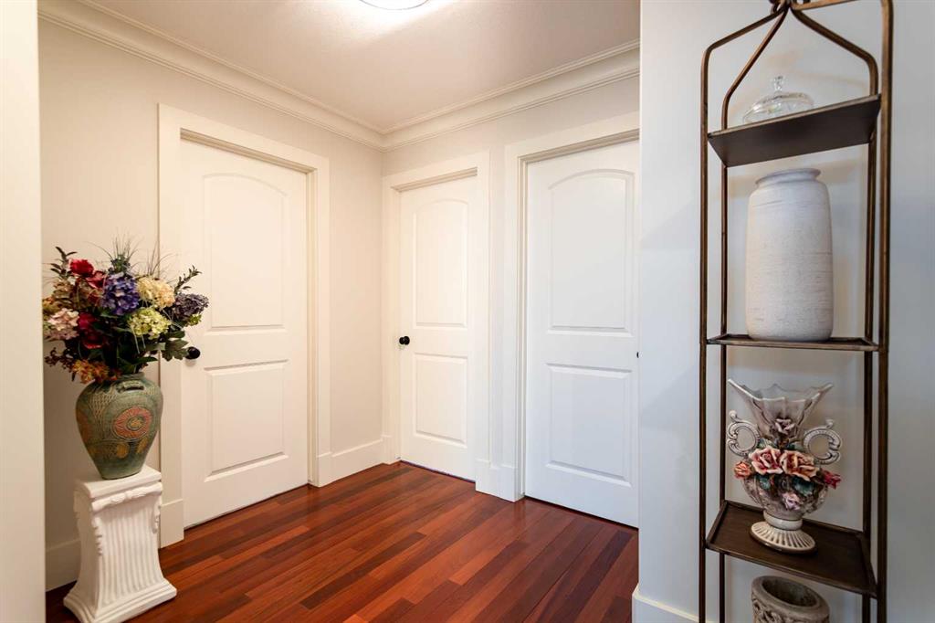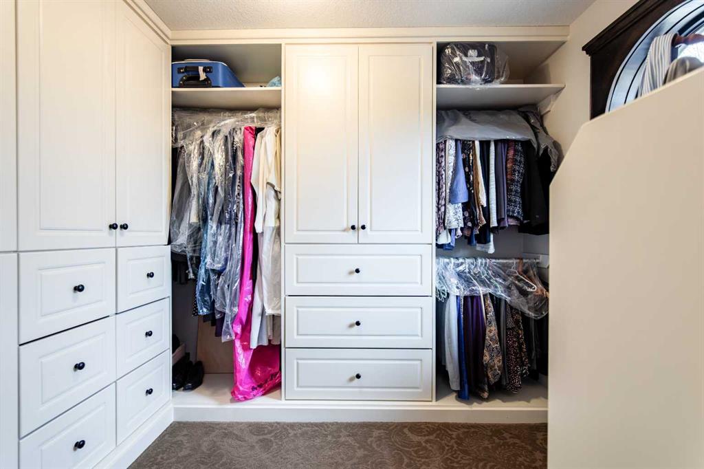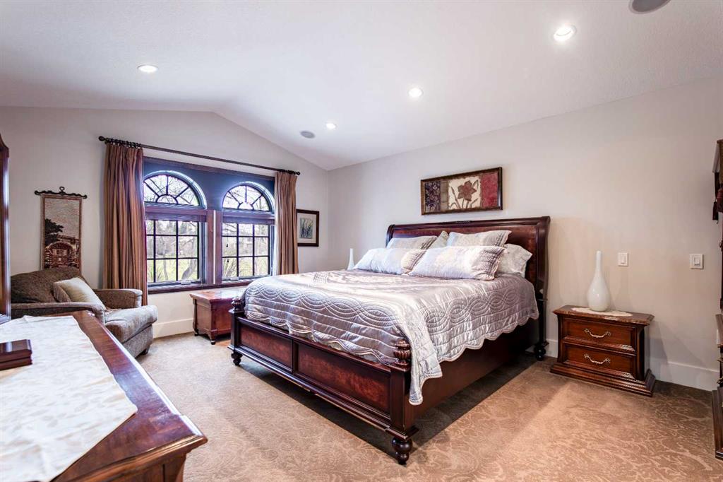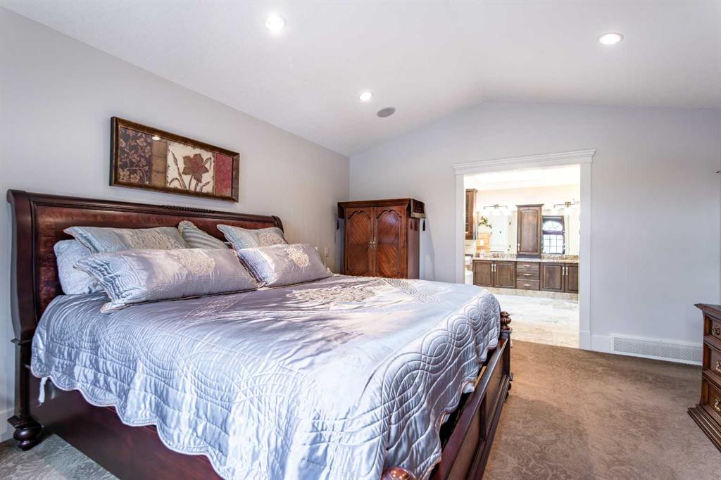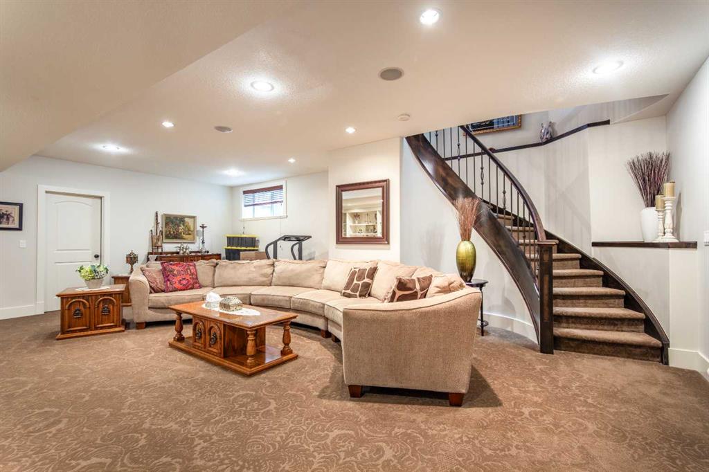 A stunning spiral staircase leads to the upper level, where you’ll find three spacious bedrooms, a convenient laundry room, and a well-appointed 4-piece bathroom. The luxurious primary suite offers a walk-in closet and a spa-like 5-piece ensuite complete with heated travertine floors, dual sinks, and a relaxing jetted tub ans lots of natural light from a large skylight.