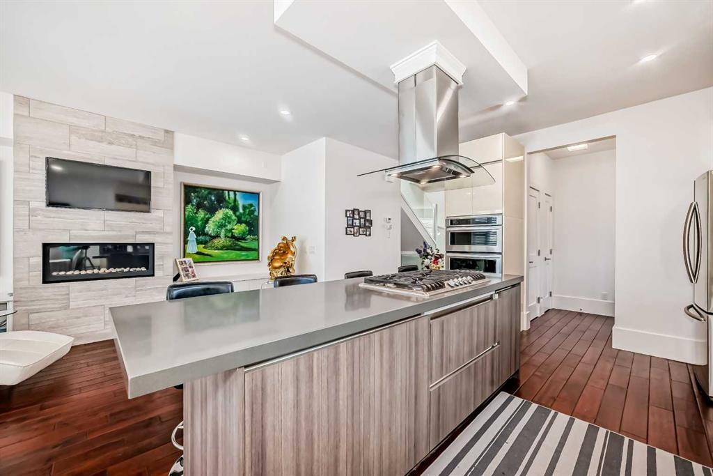 The chef-inspired kitchen is a true centerpiece, complete with built-in oven and microwave, gas cooktop, stainless steel appliances, a central quartz island with undermount sink, and a sleek glass canopy hood fan. The adjacent family room features a modern electric fireplace with glass and stone accents, along with custom built-in cabinetry. A spacious living room, dining area, and a 2-piece powder room complete the main level. The striking glass-panel staircase adds a touch of architectural elegance throughout.