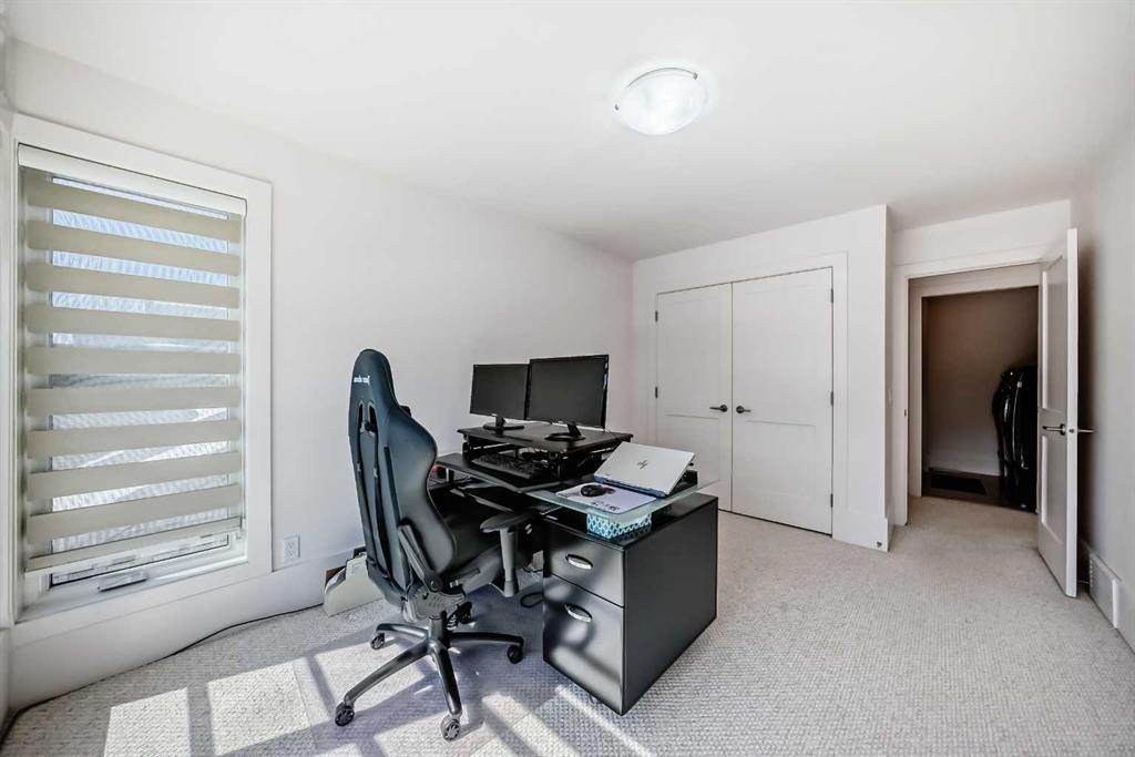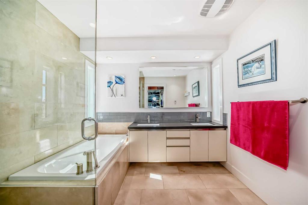 Upstairs, the luxurious primary retreat offers custom zebra blinds and a walk-through closet with built-in drawers and shelving, leading to a spa-like ensuite featuring dual sinks, a deep soaker tub, a fully tiled shower, and a custom lighted mirror. Two additional well-sized bedrooms and a beautifully finished full bathroom complete the upper level.
