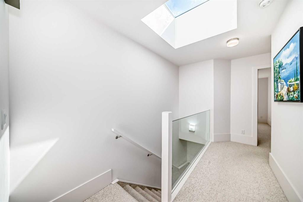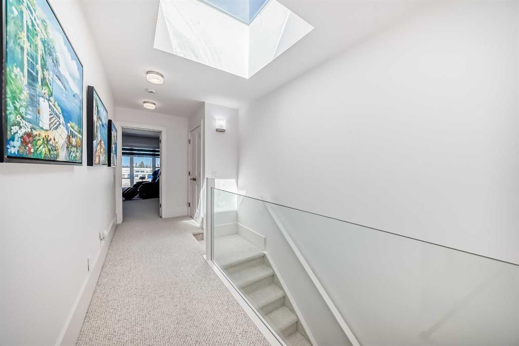 A standout feature is the dedicated laundry room with sink and extensive built-in cabinetry for added storage. The upper hallway is enhanced with glass railings and a large skylight, flooding the space with natural light.