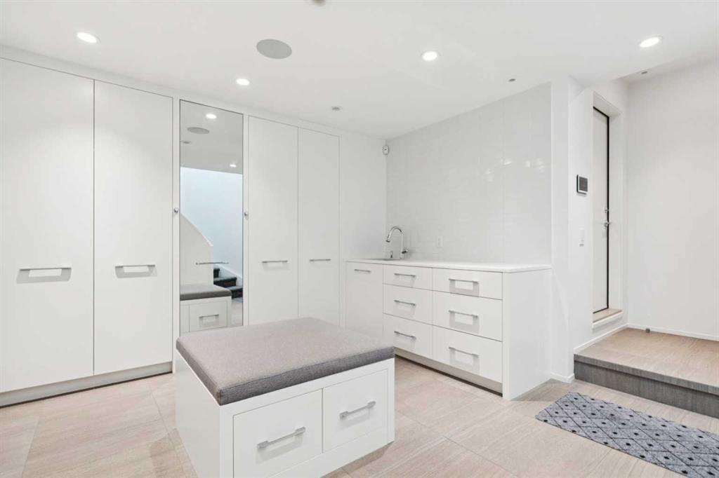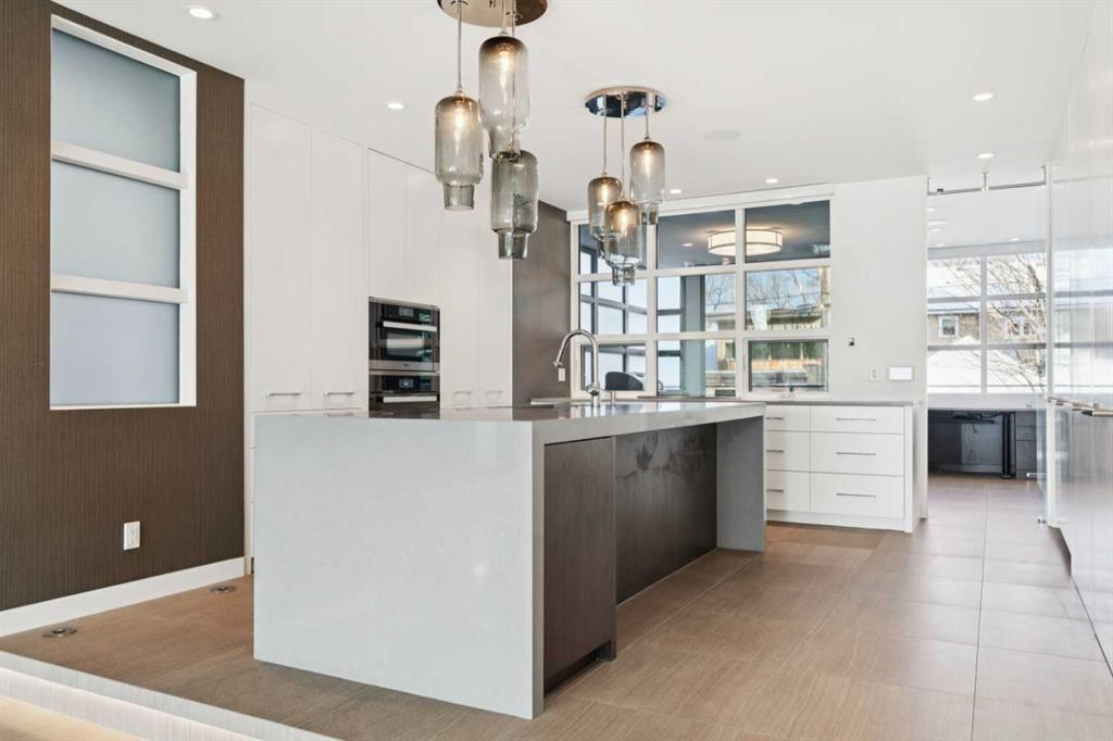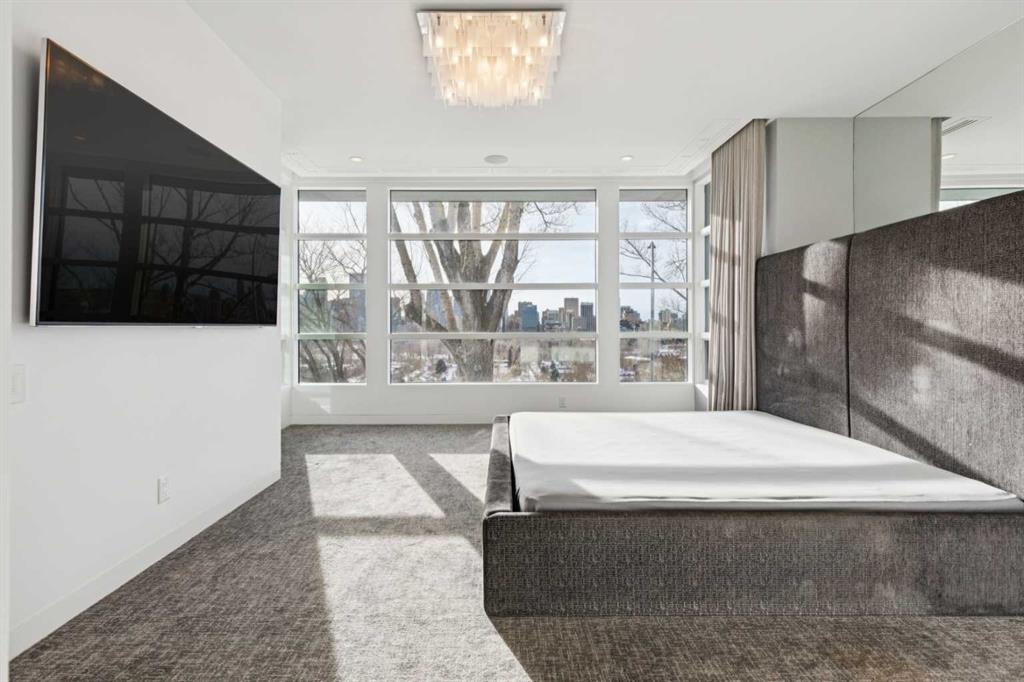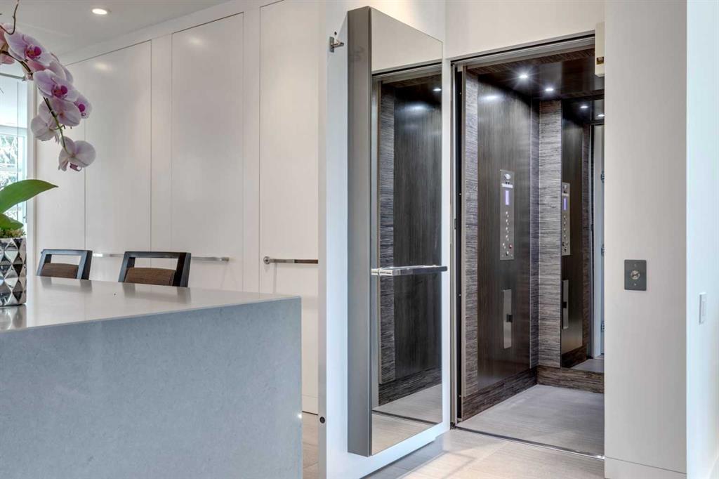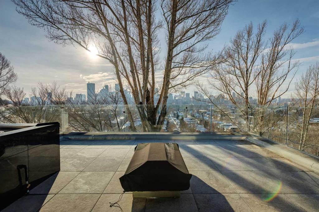 A world-class contemporary residence on prestigious Crescent Road, offering breathtaking panoramic city skyline and mountain views from one of Rosedale’s most coveted blocks, surrounded by estates valued up to $20M. Masterfully conceived by renowned architect Sean McCormick and designer Paul Lavoie, this exceptional home delivers nearly 4,000 sq ft of uncompromising luxury—perfectly suited to couples, empty nesters, or discerning singles. An elevator connects all levels, making this an ideal alternative for condo or townhouse buyers seeking space without compromise. Exquisite bespoke detailing defines the home, with integrated casings and baseboards, architectural light channels, ceiling-height custom doors, and a striking sculptural staircase—every element thoughtfully designed and flawlessly executed. The main living level features soaring 10' ceilings and full-height Austrian Reynaers sliding doors opening to a generous view terrace with fireplace. A subtle elevation change toward the rear preserves sightlines from the elegant dining area and the sleek, modern kitchen, complete with quartz waterfall island, abundant storage, and a premium Miele appliance package. A double office with adjustable-height desk and a discreet powder room complete this level, along with access to a powered-screen three-season room. The second level is anchored by a stunning primary suite with city views framed by huge windows, a spacious dressing room, and a spa-like ensuite with dual vanity, oversized shower, freestanding tub, and private water closet. A generous laundry room and a second bedroom with ensuite complete the floor. The top level offers a sprawling media lounge with home theatre, wet bar with Sub-Zero fridges and access to a private south-facing terrace with flame table and spectacular mountain and city views. A third bedroom and full bath are also located on this level. The lower level is currently configured as a gym with adjacent bathroom featuring a steam shower. A huge and well-appointed mudroom connects to the immaculate double garage with EV charger. Infrastructure highlights include in-floor heating on the main and lower levels, snow-melt for the driveway, sidewalk, and front terrace, central air conditioning and an Elan home automation system. Perimeter security gates, full alarm system, and cameras ensure peace of mind. Gorgeous professional low-maintenance landscaping completes this exceptional offering. A truly irreplaceable property of remarkable calibre—offered well below replacement cost.