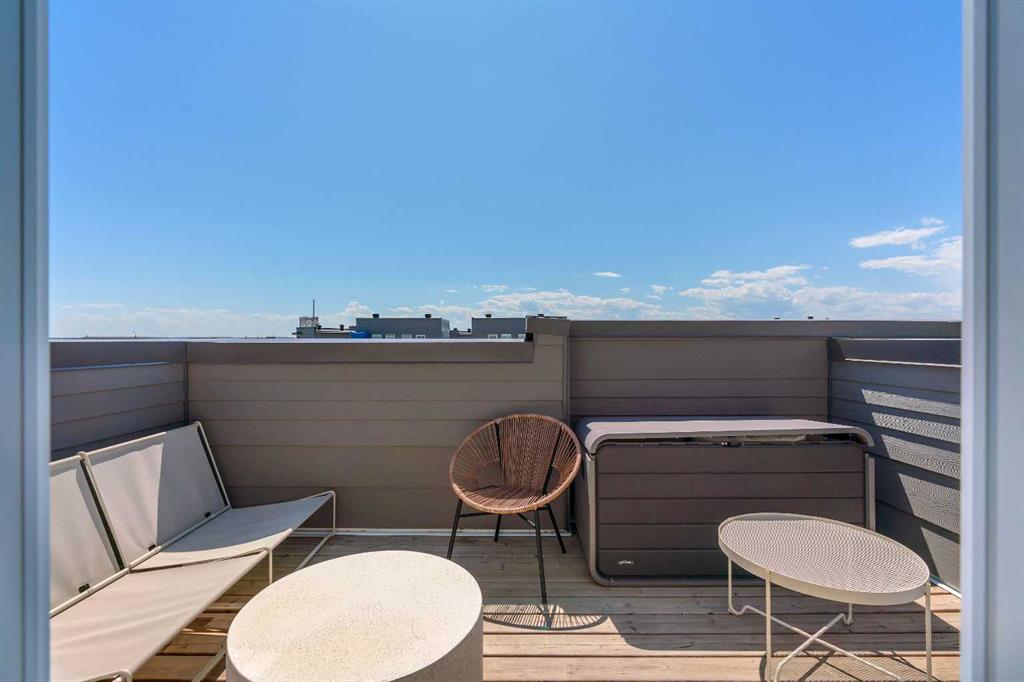 Welcome to 312, 19500-37 Street SE. A beautifully maintained, energy-efficient townhome in the sought-after Zen Urban District, ideally located in the vibrant heart of Seton. Offering over 1,500 square feet of thoughtfully designed living space across three levels, this home features 3 bedrooms, 2.5 bathrooms, and an incredible private rooftop patio with stunning mountain views. The open-concept main floor welcomes you with durable laminate flooring, a spacious living area, and a bright dining space that flows seamlessly into the modern kitchen. The kitchen boasts updated white cabinetry with a stylish blue-tone island, quartz countertops, a custom coffee station with additional uppers, stainless steel appliances, and an island with seating, all overlooking a fenced backyard. Upstairs, the primary suite features a 3-piece ensuite and a large closet, while the generous second bedroom is steps from a modern 4-piece bathroom. A convenient laundry closet is also on this level. Head up to the third floor to find a versatile loft-style third bedroom or flex space—perfect for a guest room, home office, TV room, or gaming area—along with direct access to the rooftop patio. Additional features that set this home apart include air conditioning for year-round comfort, designer wall treatments and upgraded window coverings for a polished aesthetic, and modern finishes throughout that make the home feel fresh and contemporary. It shows like new, reflecting the care and pride of ownership. Located in a prime interior spot within the complex, the home offers added privacy and quiet. Plus, with ZEN’s EnerGuide™ rating, you'll benefit from an average of 36% energy savings each month, ensuring long-term value and efficiency. Live steps from the South Health Campus, shops, restaurants, cafes, fitness facilities, a movie theatre, and all the amenities that make Seton one of Calgary’s most dynamic communities.