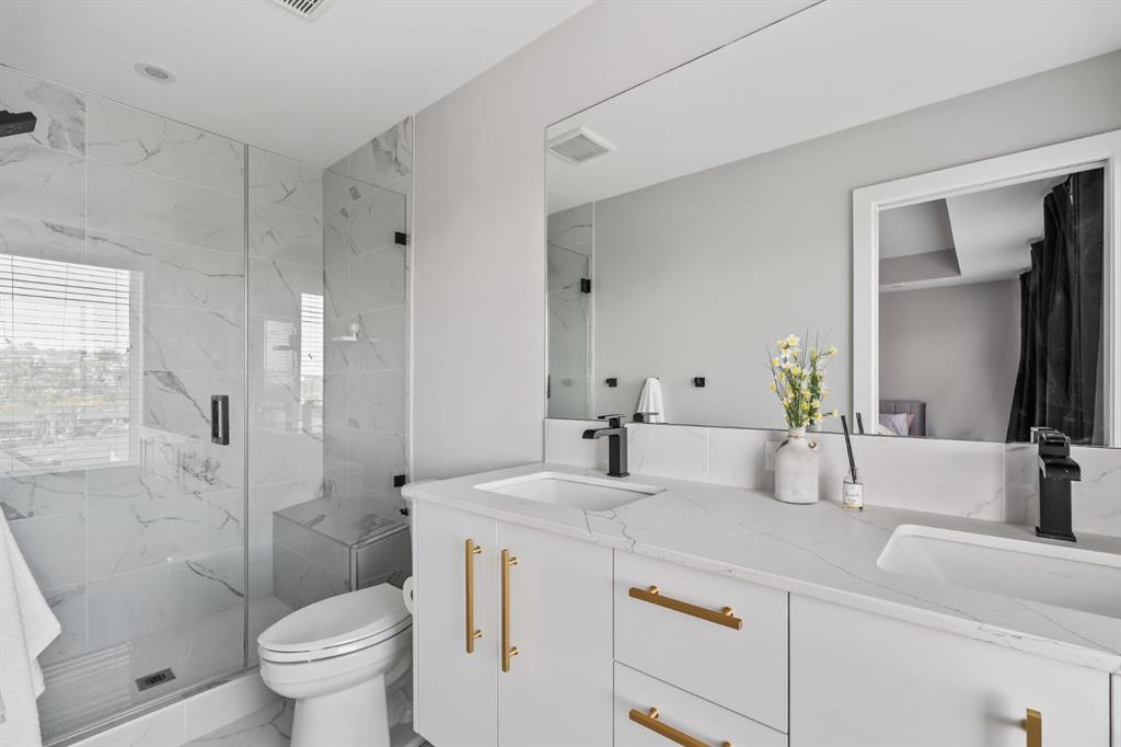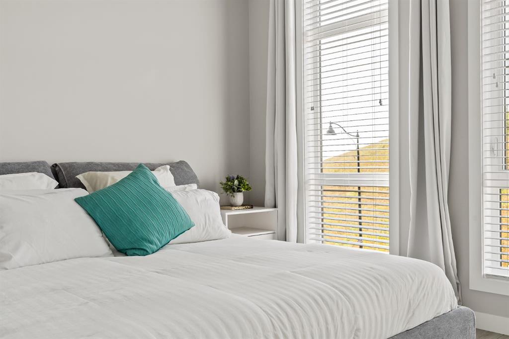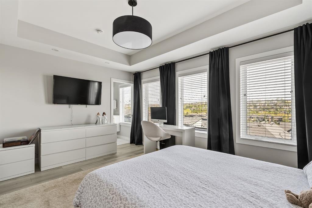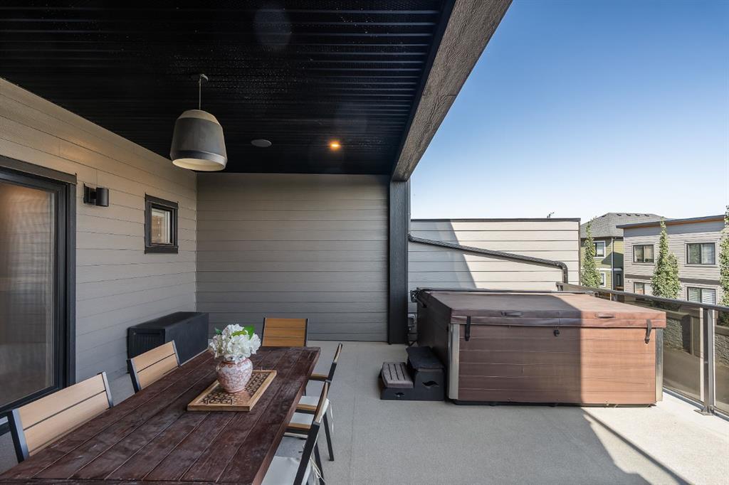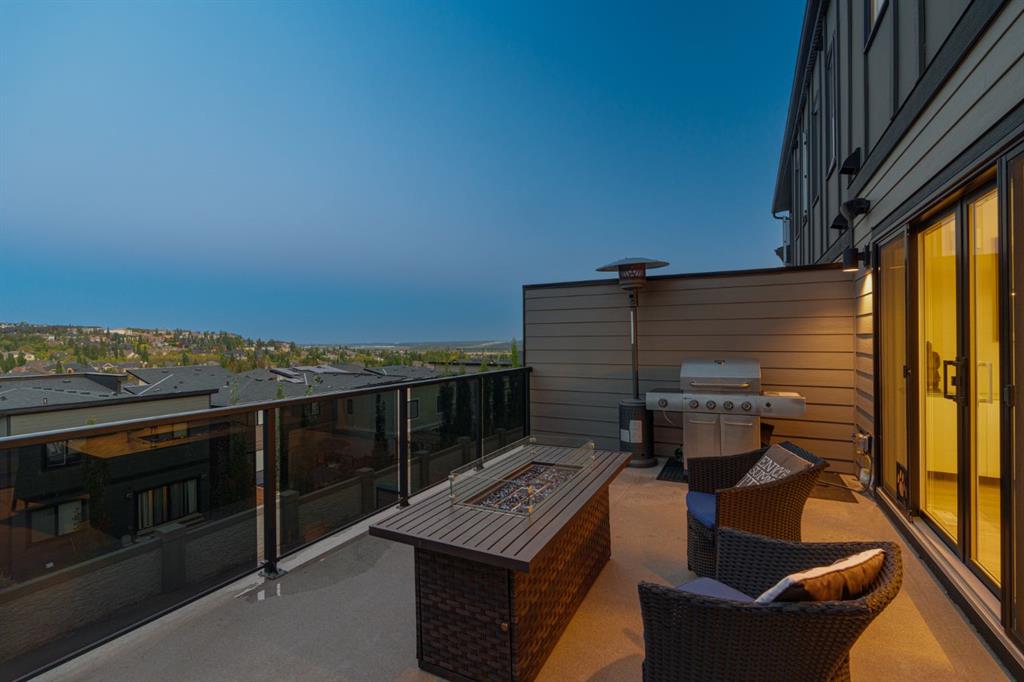 Executive living at its finest on Calgary’s WONDERFUL Upper Westside. This three storey townhome, just three years young, offers 2565 sq ft of living space over three levels with all of the latest design elements. Situated at the top of the hill this home presents a wonderful view to the SE, all the way to the Glenmore reservoir and exposure to a grassy knoll and the mountains to the west – a COMFORTING sense of space. With its east/west orientation, and generous window treatments, this home follows the sun, offering a WARM & BRIGHT home, on all three levels. On arrival you will enjoy the broad, open plan under 9’ ceilings with resilient luxury vinyl flooring, designer lighting and window treatments and a kitchen featuring Fisher Paykal s/s appliances, including a gas stove. There is a generous dining space here, leading directly to a large rear deck, measuring 240 sq ft – WITH A VIEW! Upstairs you will find a double primary floor plan. The primary bedroom sits under 10’ ceilings with a view to the west and features a 5pc en suite with quartz countertops and large walk-in closet. The second primary enjoys views to the Glenmore reservoir, a 4pc en suite and large walk-in closet. The lower level has been developed for entertaining with a large rec/media space leading directly to a second large covered deck… 423 sq ft with a fantastic HOT TUB… WITH A VIEW! This level also enjoys a large flex space, which easily accommodates a sleeping space for guests and a 3rd full bathroom. This home offers an attached, HEATED & OVER-SIZED garage, multi media ethernet cabling and 15 B/I speakers throughout and an ELEVATOR serving all four levels! This is a turnkey lifestyle with an ELEVATOR which presents an opportunity to age in place… on Calgary’s Upper Westside!!