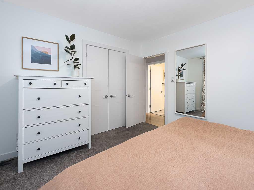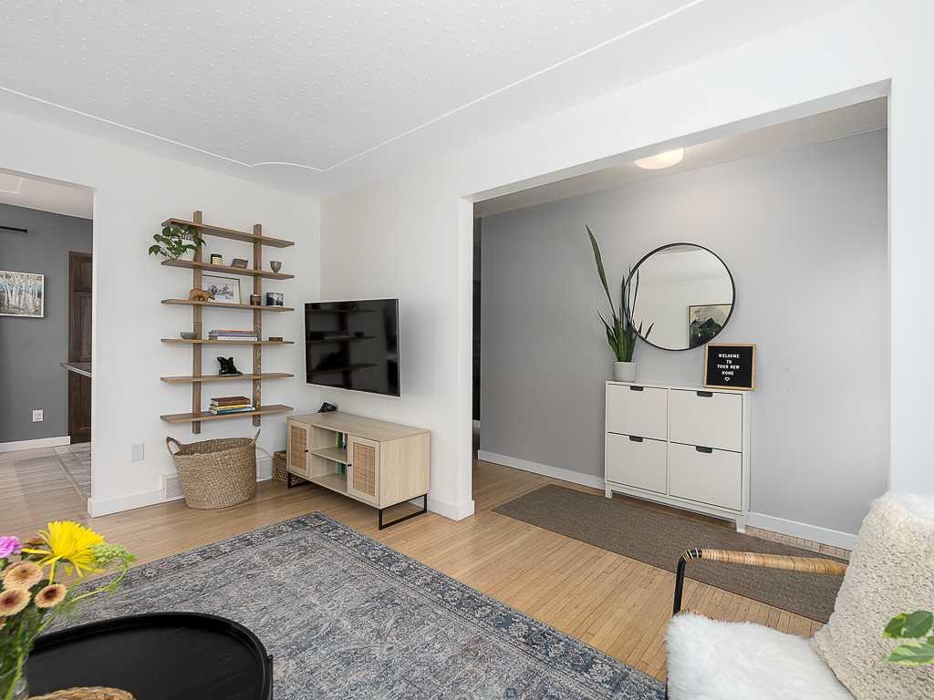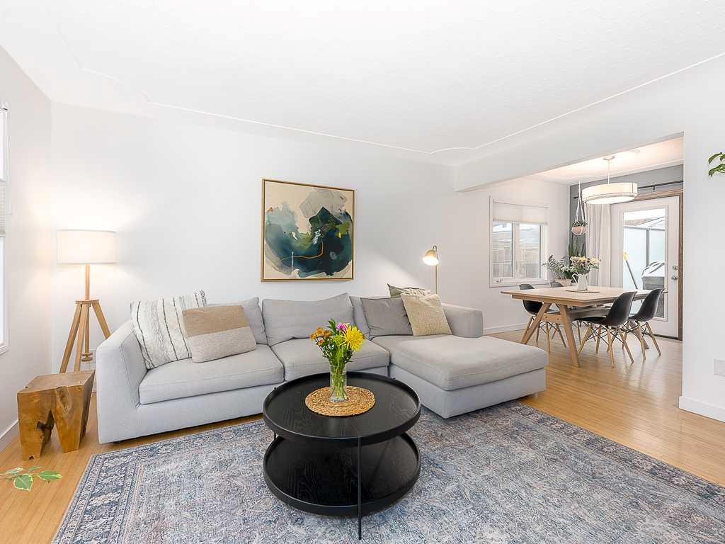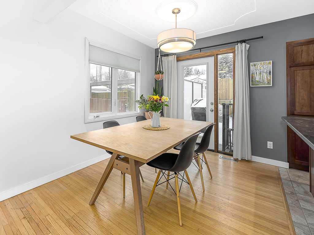 The main level features bright, expansive windows that fill the living and dining areas with natural light. The chef-inspired kitchen is a showstopper, boasting custom full-height cabinetry, under-cabinet lighting, high-end stainless steel appliances, a large granite island with seating, and a built-in beverage fridge — perfect for entertaining family and friends. Original hardwood floors flow throughout the main living spaces, leading to a spacious primary bedroom, two additional bedrooms, and a beautifully updated 4-piece bathroom.