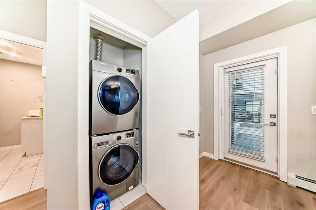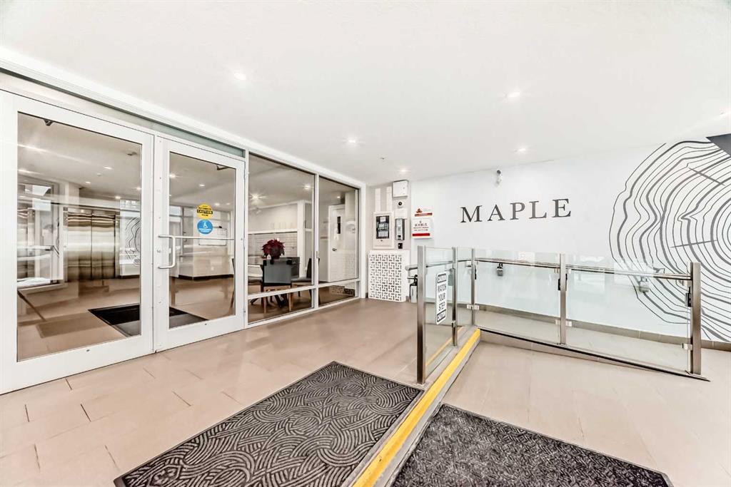 Welcome to this bright, ground-floor 1 bedroom condo in the Maple, a 55+ community in Calgary’s University District. Offering 537 ft² of open-concept living, the home features 9-foot ceilings, durable vinyl plank flooring, and large triple-pane windows that bring in abundant natural light. The kitchen includes quartz countertops, stainless steel appliances, and a central island providing additional workspace. The living area opens directly to a south-facing patio, offering easy outdoor access without reliance on elevators. The bedroom is complemented by a modern 3-piece bathroom, in-suite laundry, and barrier-free accessibility throughout. Parking is included with a titled stall in the underground heated parkade. Residents can enjoy access to Cambridge Manor, which offers optional dining, fitness facilities, salon services, social programming, and priority access to higher levels of care. Steps from shopping, transit, the University of Calgary, Foothills Hospital, and the growing amenities of University District, this home offers independent living with valuable support options close at hand.
