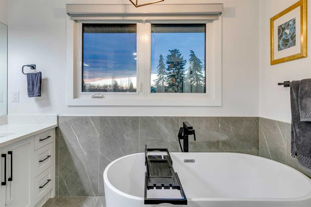 Upstairs, you’ll find continued hardwood flooring and a stunning primary suite designed for comfort and sophistication. The room features a soft grey accent wall, large window, custom walk-in closet, and a beautiful barn door that leads to the luxurious spa inspired 5-piece ensuite. The ensuite includes a modern double-sink vanity, freestanding soaker tub, and a glass-enclosed shower with. A secondary bedroom overlooks the front yard and green space across the street, while a nearby 4-piece bathroom offers matching quartz counters with a tiled tub & shower combo.
