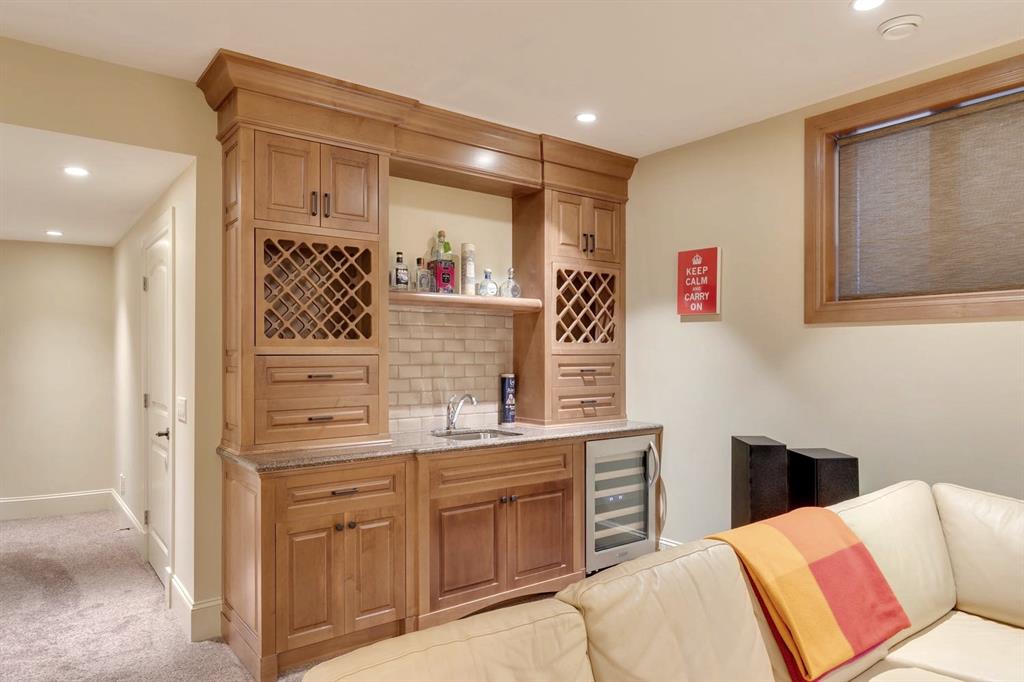 Canopy trees line this family friendly street in coveted West Hillhurst. Boasting over 4,460 sq.ft. of developed living space with fine European finishes, this stunning executive home showcases a gracious 24ft vaulted foyer, and oak hardwood floors. The low maintenance front yard offers underground sprinklers and lush easy to maintain perennials. A front porch is ideal to relax on and welcomes you as you make your way inside to a spacious foyer and large office separate from the main living areas for the utmost privacy. A spacious formal dining room is highlighted by coffered ceilings, while an inviting living room is anchored by custom built-ins and a gorgeous gas fireplace. Culinary enthusiasts will love the gourmet kitchen with solid maple custom cabinets, high-end appliances (Miele and Subzero), and walk-through pantry with access to a large mudroom. The extensive centre island features granite counters and ensures room for entertaining as everyone gathers around. A dramatic curved staircase leads up to a full bathroom and three generous bedrooms, all with walk-in closets. The tranquil primary presents downtown views from the sitting area and features a 2-way fireplace that leads to the lavish 6pc ensuite complete with in-floor heat, jetted soaker tub and separate shower. A convenient upstairs laundry room includes storage, sink, and wraps around to a gorgeous balcony that overlooks the front street. The fully developed lower embraces heated floors, an extensive rec room with custom media built-in and wet bar. Two generous bedrooms, one ideally functioning as a home gym, along with a full bath complete the level. Extend your outdoor living in the south exposed backyard. Dinners on the outside deck extend your space for entertaining or you can relax and unwind after a long day on the lower patio or practice your putts on the mini green. Located within steps to the Karl Baker off-leash dog park, Helicopter Park, the Bow River Pathways system, the Foothills Hospital, and mere minutes to great restaurants, trendy Kensington, and the Downtown Core. This real estate gem is a masterpiece of quality workmanship and ready for you to call "home."