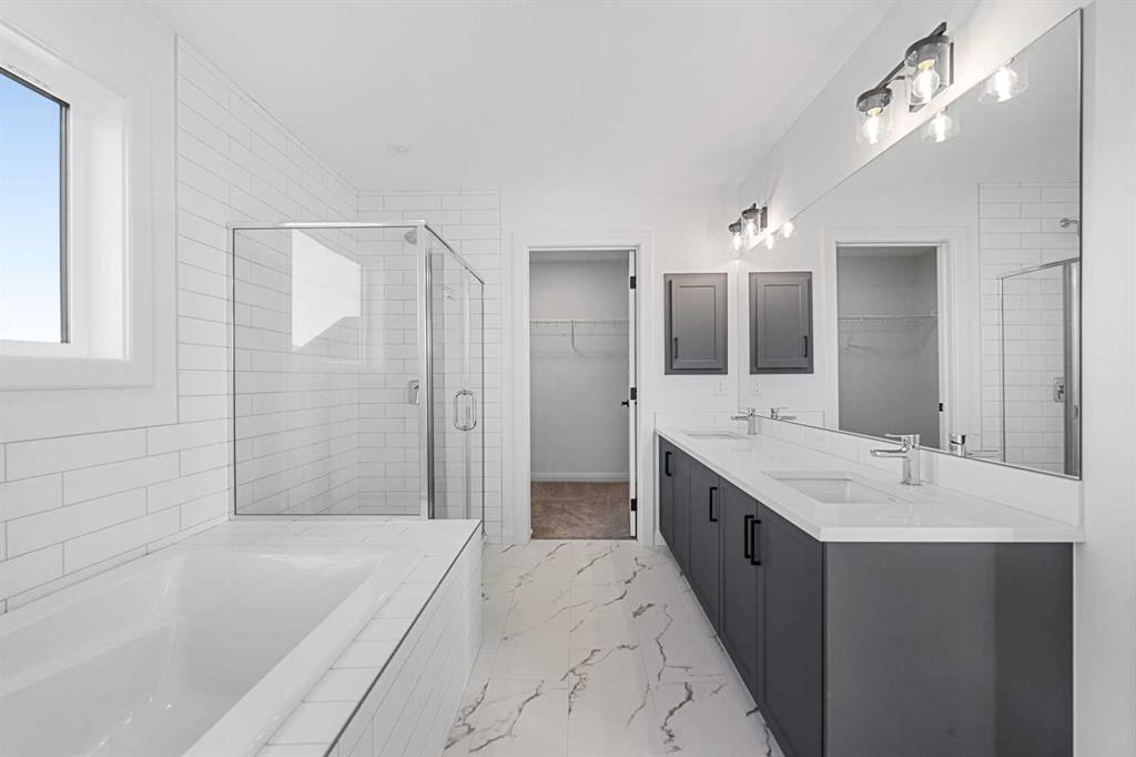 Step into elegance with The York by Broadview Homes, a beautifully crafted move-in ready residence offering 2,017 square feet of thoughtfully designed living space across the main and upper levels. This brand-new contemporary home blends modern luxury with everyday comfort, creating the perfect setting for upscale family living. At the heart of the home, the chef-inspired kitchen is a true showstopper—featuring gleaming granite countertops, 42" upper cabinets with crown molding, soft-close cabinetry, and premium stainless steel appliances, including a gas range. A walkthrough pantry offers direct access to the mudroom and interior garage entry—perfect for effortless grocery drops. The open-concept dining area is ideal for hosting intimate dinners or large family gatherings, while the spacious great room is anchored by a stylish electric fireplace, creating an inviting ambiance. Designed with flexibility in mind, the main level offers a flex room - a great space for a bedroom and 4-piece bath, making it ideal for multigenerational living or a private guest bed. Upstairs, discover three additional generously sized bedrooms, a central bonus room, and a convenient laundry room. The lavish primary retreat is your private sanctuary, complete with a spa-inspired 5-piece ensuite featuring dual vanities, a deep soaking tub, walk-in glass shower, private water closet, and a spacious walk-in wardrobe. Additional upper bedrooms share a well-appointed 4-piece bathroom with a tub/shower combination, and the bonus room is perfect for cozy family movie nights or a relaxed lounge space. The 9-foot basement ceilings and rough-in plumbing offer endless potential for future development. This home is equipped with a 200 AMP electrical panel, two-stage furnace, and triple-car garage, providing ample space for vehicles, hobbies, and storage. Every detail has been carefully curated, from the maple hardwood and luxury vinyl plank flooring, to tile in all wet areas, superior carpeting, pot lights in the kitchen, and custom cabinetry by Wildwood Cabinets. Don’t miss your chance to own this luxurious, move-in ready masterpiece by Broadview Homes. Schedule your private showing today and experience the elevated lifestyle that awaits!