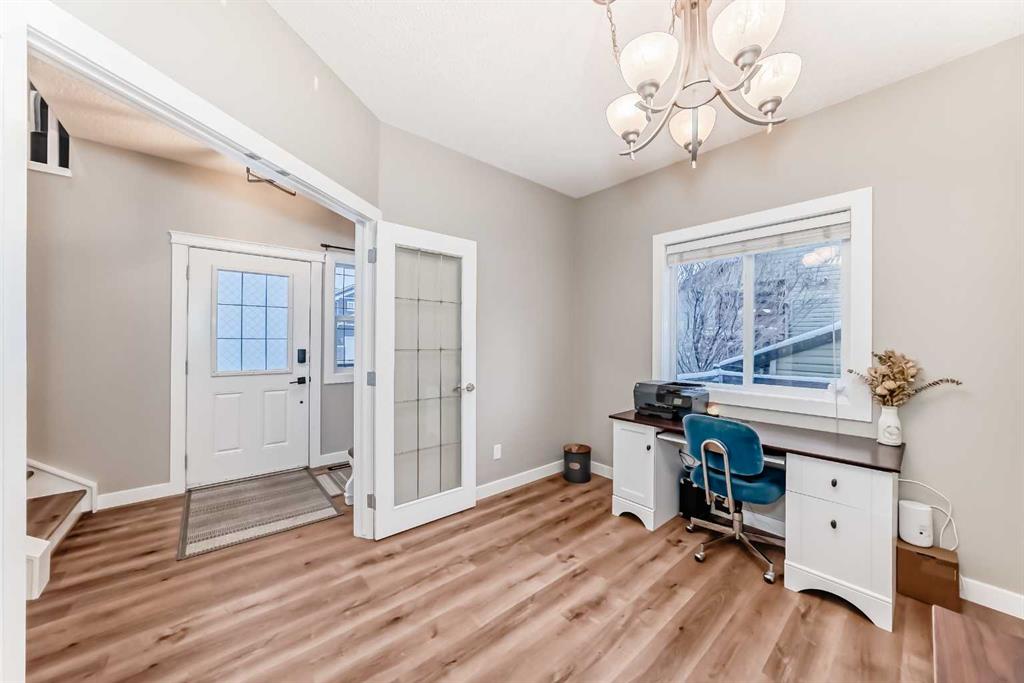 features major recent upgrades, including a new roof in 2021 for ultimate peace of mind. Step inside to a refreshed main floor showcasing brand-new LVP flooring, a designated office/flex space, and convenient main-floor laundry hookups. The open-concept living area is an entertainer's dream, featuring a kitchen with quartz countertops and a large pantry, a dining area that opens to your beautiful backyard oasis, and a cozy living room anchored by a gas fireplace. Upstairs, you'll find an oversized bonus room complete with an electric fireplace and stunning mountain views. The spacious primary suite is a true retreat with a 5-piece ensuite and walk-in closet. Two additional good-sized bedrooms and another full bathroom complete the upper level. The fully finished basement provides even more living space, offering a family rec room, a wet bar, a flex room, ample storage, and a 3-piece bathroom. Perfectly located close to parks, pathways and a beautiful golf course. Enjoy the best of quiet, small-town living with a quick and easy commute to Airdrie and Calgary. This one is a must-see!