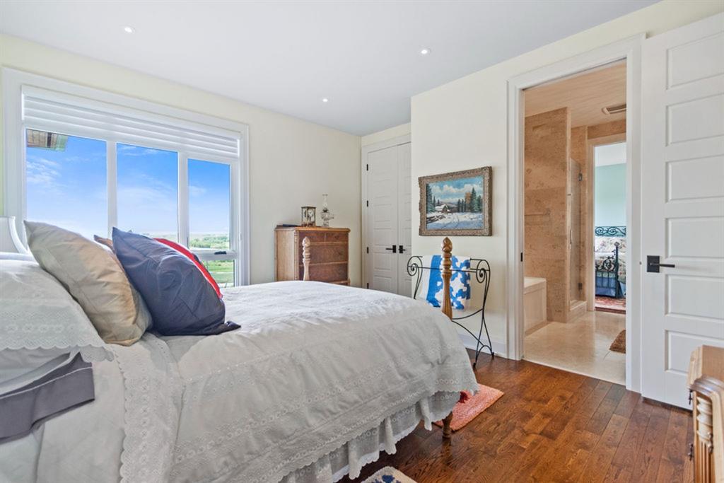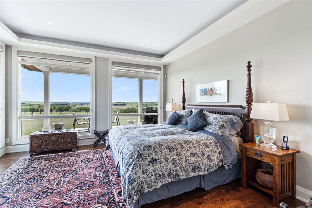 Stunning Custom Built Bungalow sitting atop the biggest hill on 122 acres with breathtaking views in all directions. Unobstructed mountain views to the west, golf course to the north, the friendly hamlet of madden east and south for miles! Enter from your gated private paved lane-way and find this architectural thing of beauty at the peak. This home is just shy of 4000 sq/ft on the main level and boasts another 2700sq/ft of developed space in the basement. The main floor has gleaming hardwood flooring throughout along with slate entry and heated tile flooring in all the bathrooms. Oversized low UV transmission windows with Hunter Douglas blinds throughout helps capture the most amazing landscapes. The executive chefs kitchen has stainless steel appliances including a Wolff gas stove, Sub Zero fridge, Dacor wall oven and microwave. All cabinetry milled by Legacy with soft close and upgraded shelving and storage. Huge center island with Cambrian Black satin granite is a classic focal point in this exquisite home. There are two dining areas for all sizes of gatherings and a huge living room with descending TV from the ceiling and natural gas fireplace. The large master bedroom comes with a 4 piece en-suite with modern tiled shower, his/her sinks in Bianco Rhino marble and a walk in California closet. Main floor is completed with two other bedrooms with California closets and Jack n Jill 4 piece bathrooms, an office, and den adjacent dining room. The second fireplace is found in the library or study for those that like to kick back with a glass of wine and enjoy a good book. Basement is finished with a huge family/ games room and tons of storage. The attached triple garage measures 38x22 it has a separate entry and big bright windows and upgraded wood doors. The west facing concrete patio is covered with skylights so you can enjoy it in all weather! The property is professionally landscaped with mature trees and raised garden boxes for the green thumb. Extra features include 2 independent furnaces and AC systems, in-floor heating, water softening system, instant hot water, in-wall Vacu flo, Sonos sound, Security system and more! Combination of pasture and grade A crop land with good perimeter fencing. Rare opportunity to own a beautiful parcel of land this size commutable to Calgary with an equally magnificent home to match!
