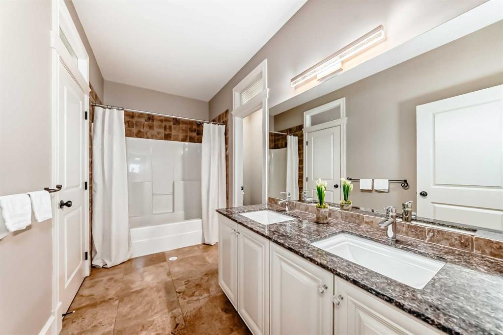 Built with efficiency in mind, the home features triple-pane windows and R35 insulated walls, contributing to strong overall energy performance and low energy bills. The upper level includes a well-appointed primary suite with a see-through natural stone wrapped fireplace showing through to the 6-piece ensuite, which features a spacious walk-in closet, a double-width jetted tub, and a full body shower/two-person steam room. Three additional bedrooms, a 5-piece bathroom, and a full laundry room with a sink and Bosch appliances complete the main-upper level.
