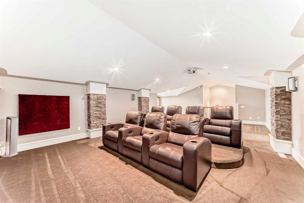 The second level features a dedicated theatre room with fully reclining leather seating, its own separate bathroom, and private balcony, creating a true at-home cinema and entertainment space.